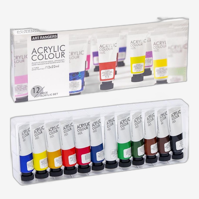 - Дванадцять кольорів акрилових фарб Art Ranger по 22 мл для живопису, декору та різних творчих технік. Хороша укривність і стійкість після висихання. Підходять для полотна, дерева та інших поверхонь.
