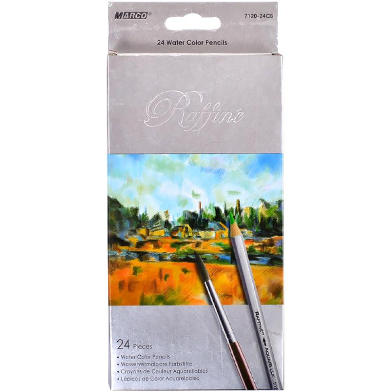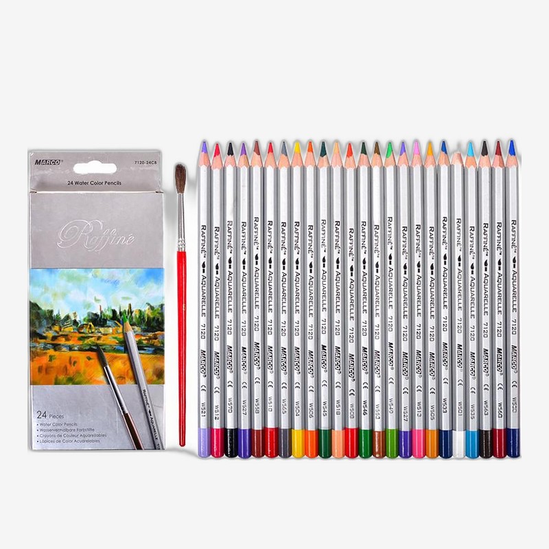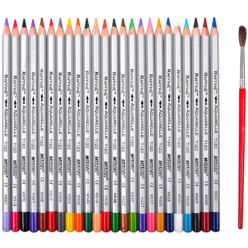 - Акварельні олівці Marco Raffine у наборі з 24 кольорів — м'який грифель добре лягає на папір. При змочуванні пензлем дають плавний акварельний ефект. Підходять для двох технік малювання: сухої та вологої.