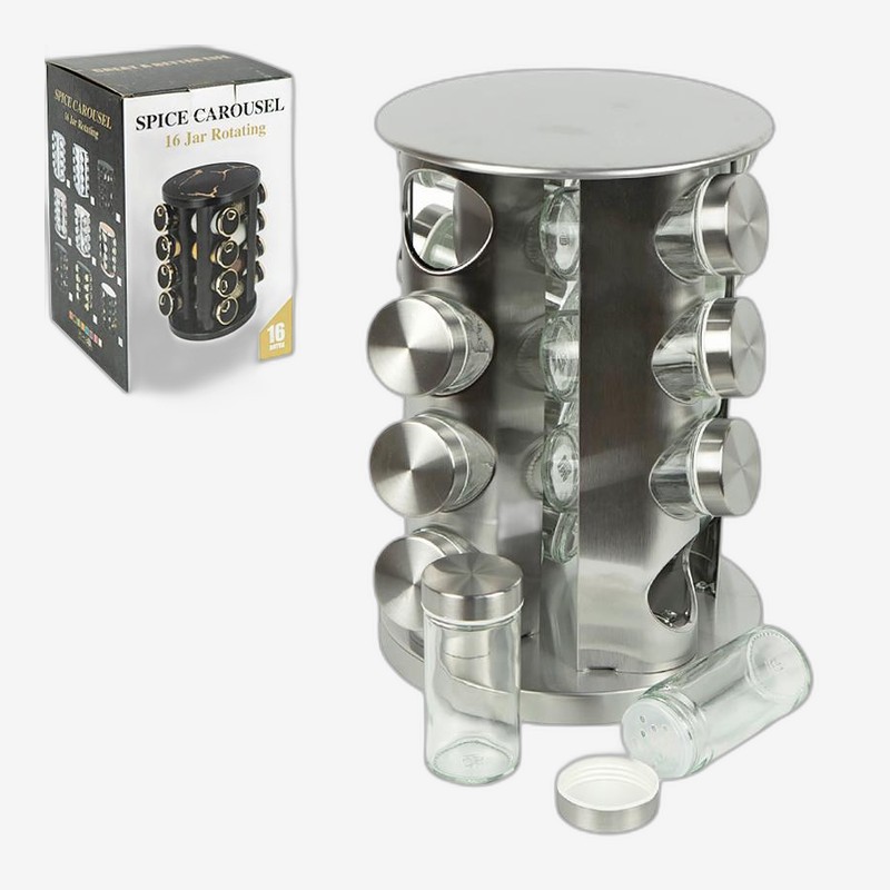 • Набір із 16 скляних баночок для спецій на зручній обертовій підставці розміром 27×19 см. Карусель обертається на 360° для швидкого доступу до будь-якої баночки без пересування підставки. Ідеально для організації кухонної стільниці та зберігання приправ під рукою.