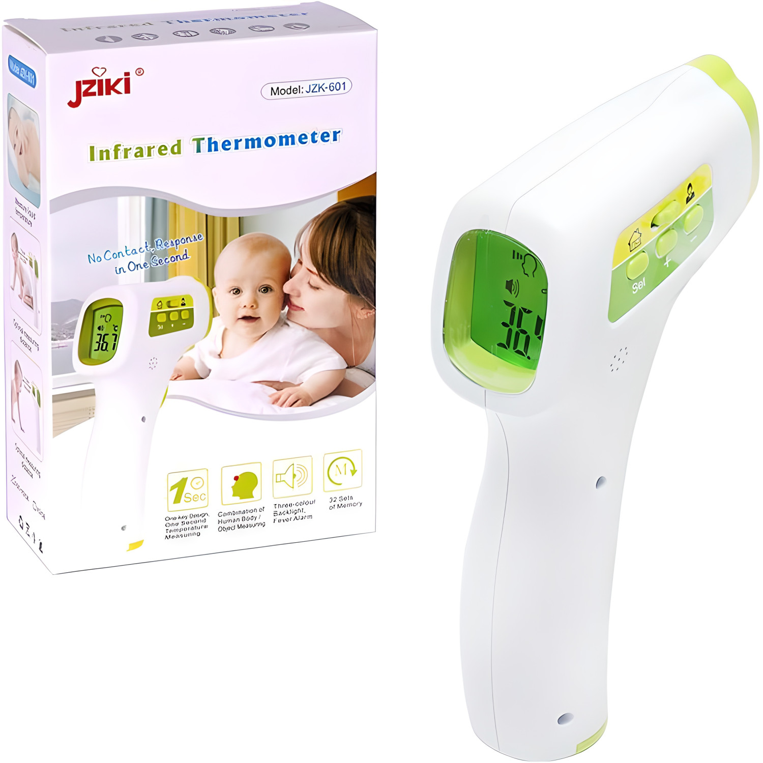 Безконтактний ІЧ-термометр для миттєвого вимірювання температури тіла, предметів і поверхонь без фізичного контакту. Результат відображається на дисплеї за 1 секунду — зручно для дітей і дорослих. Гігієнічний спосіб вимірювання для домашнього та медичного використання.