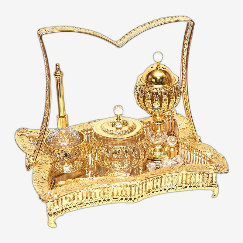 - Елегантний чайний набір із золотистим покриттям на декоративній підставці B22J0223 — вишуканий подарунок для любителів чаювання. Усі предмети набору виконані в єдиному стилі для гармонійного сервірування столу. Підходить для домашнього використання та урочистих виходів.