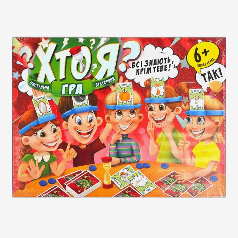 - Велика версія гри «Хто я?» українською — класична гра на вгадування персонажа, наклеєного на лоб, ідеальна для великих компаній. Широкий набір карток охоплює різні тематики та рівні складності. Підходить для дітей від 7 років і дорослих.