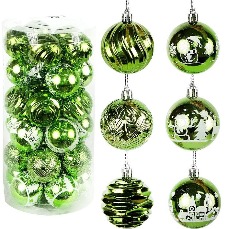 - 30 зелених кульок діаметром 6 см: 15 із малюнком і 15 рельєфних у трьох різновидах кожного типу. Яскраве зелене поєднання для традиційного святкового оформлення. Зберігаються в тубусі 16×31 см.