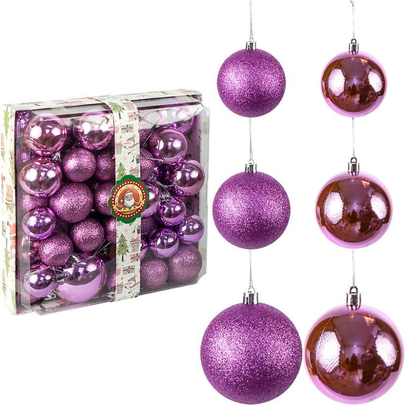 - 42 пластикові кульки чотирьох діаметрів (4/5/6/7 см) у фіолетовому кольорі з глянцевою та блискучою поверхнею. Різноманітні розміри дозволяють красиво заповнити ялинку будь-якого формату. Подарункова упаковка 23×23×8 см.