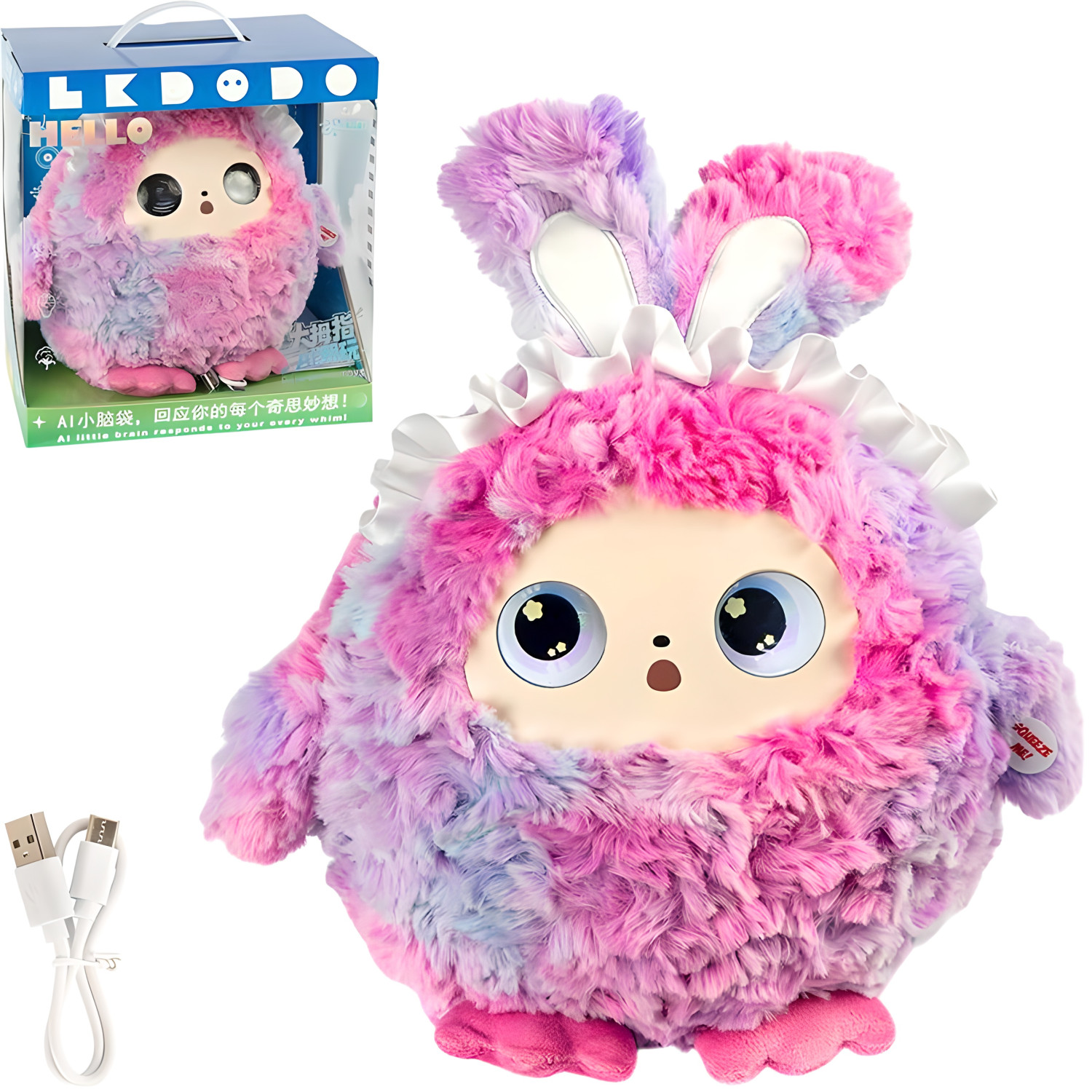 Розвивальна іграшка зі штучним інтелектом для спілкування та розваги дитини. Підключається до смартфона через Wi-Fi (2.4 GHz) та Bluetooth, керується додатком Tuya. Підтримує голосову взаємодію: відповідає на запитання, підтримує розмову та реагує на дії користувача. Розмір з вушками — 30×30×16 см.