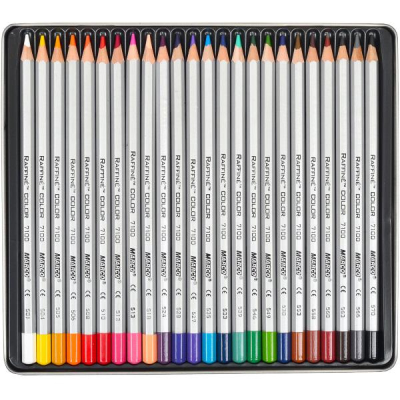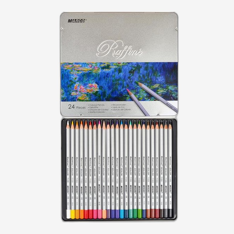 - Олівці Marco Raffine із 24 кольорами в металевій упаковці — надійні та зручні для щоденного використання. М'який, але стійкий стрижень дозволяє малювати лінії різної товщини. Підходять для школярів і любителів малювання.
