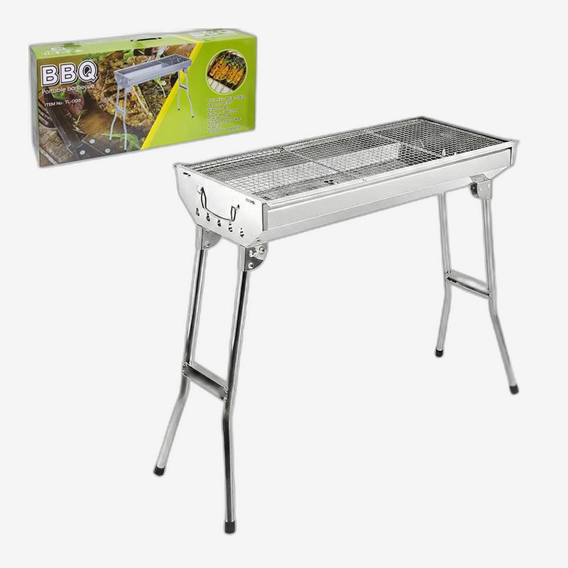 - Великогабаритний мангал на складних ніжках для серйозних виїздів та сімейного відпочинку. Комплект містить дві гриль-решітки (43×30 і 26×30 см) та дві вугільні решітки 36×18 см. Зроблений із нержавіючої сталі, складений розмір: 38×34×11 см.