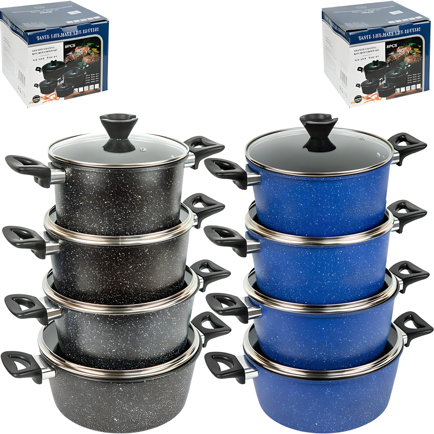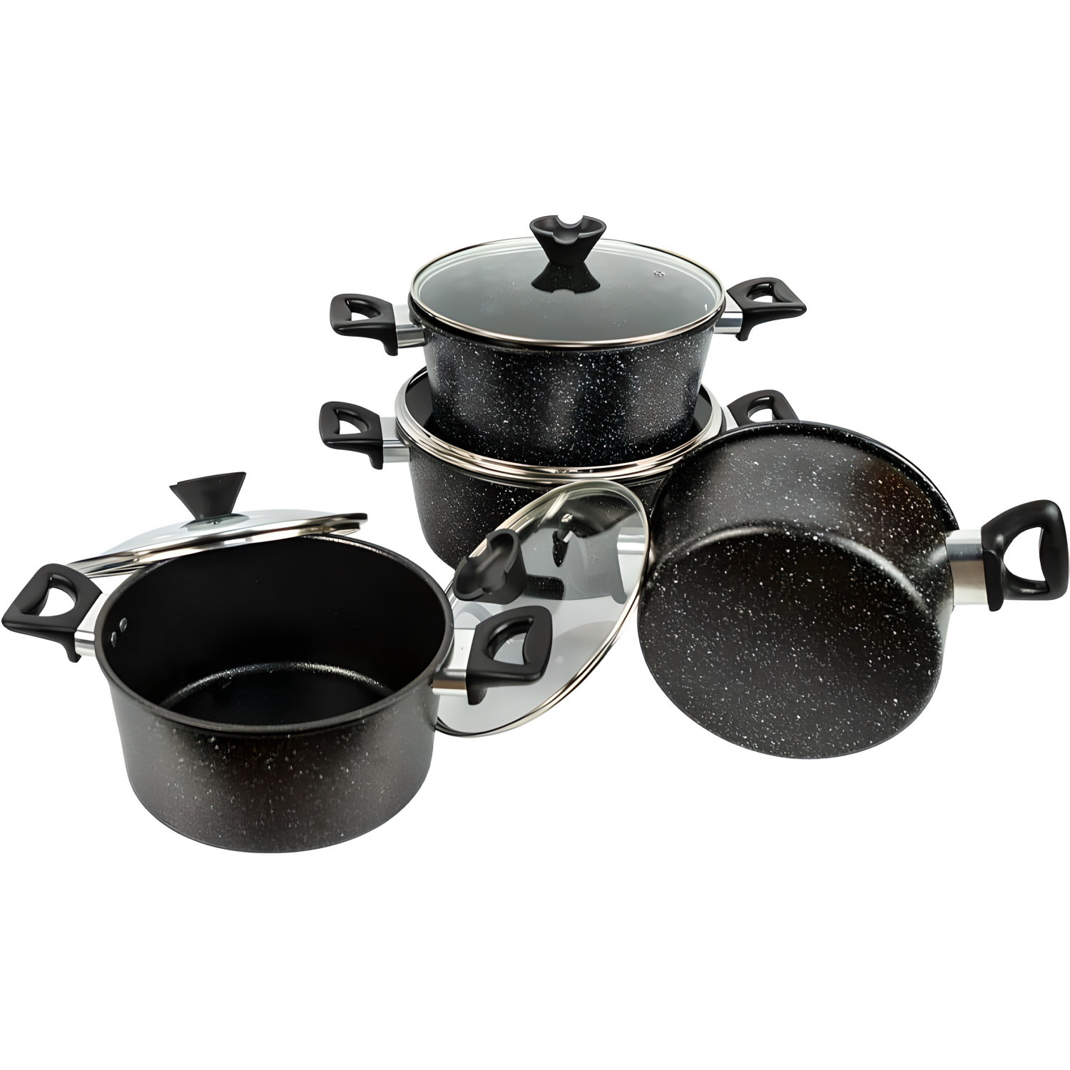Набір каструль з гранітним антипригарним покриттям підходить для приготування різноманітних страв та щоденного використання на кухні. До комплекту входять 4 каструлі об'ємом 3 л, 3,5 л, 4 л та 5 л. Діаметр відповідно: 20 см, 22 см, 24 см та 26 см. Усі каструлі комплектуються скляними кришками з металевими ободами.