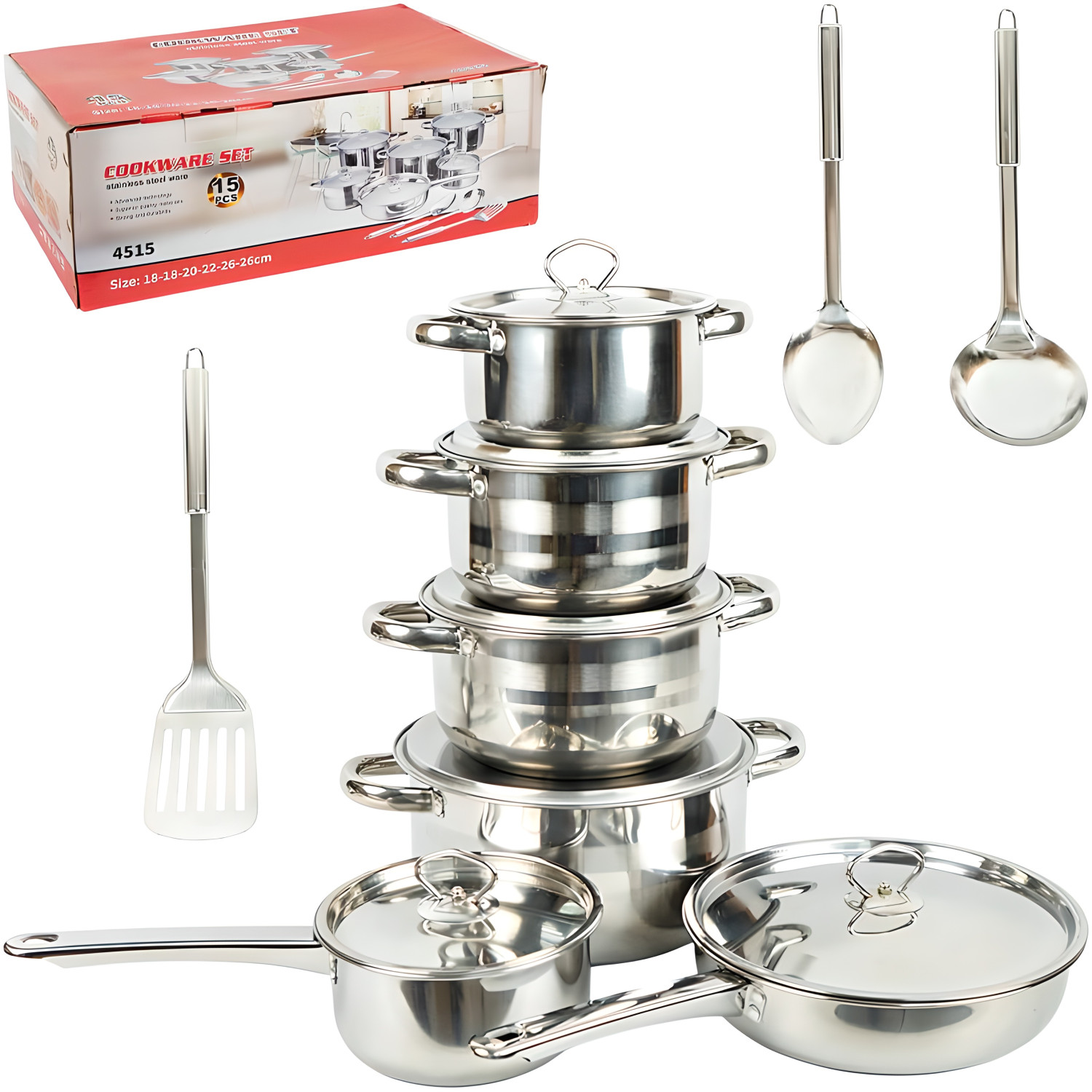 Повний кухонний набір: каструлі та сковорода п'яти розмірів із кришками — 15 предметів із харчової нержавіючої сталі. Рівномірне нагрівання, стійкість до корозії і зручність догляду. Підходить для всіх типів плит.