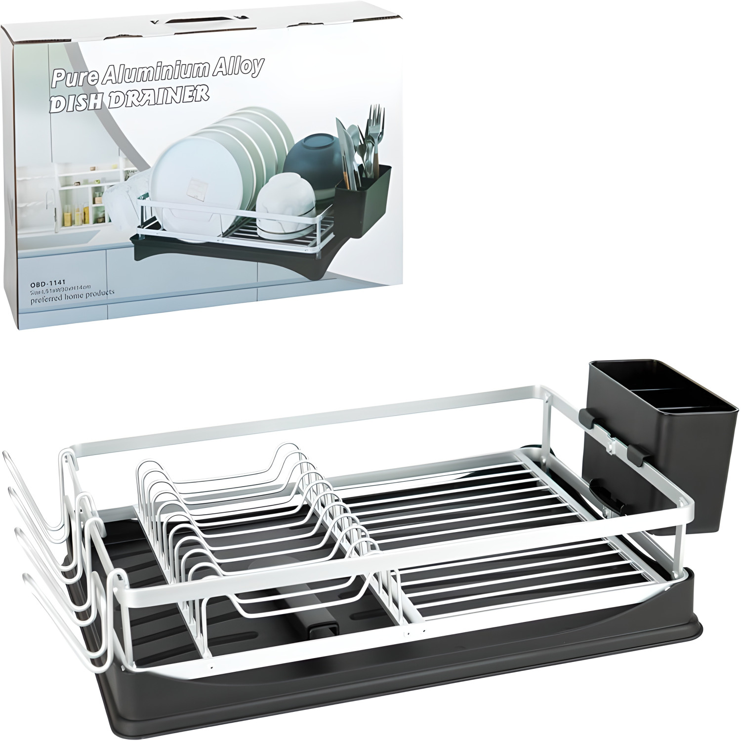Вузька настільна сушарка для посуду розміром 41×10×30 см із знімним піддоном і тримачем для столових приборів. Вертикальне розміщення тарілок заощаджує місце на стільниці. Знімні компоненти полегшують очищення і сушіння сушарки.