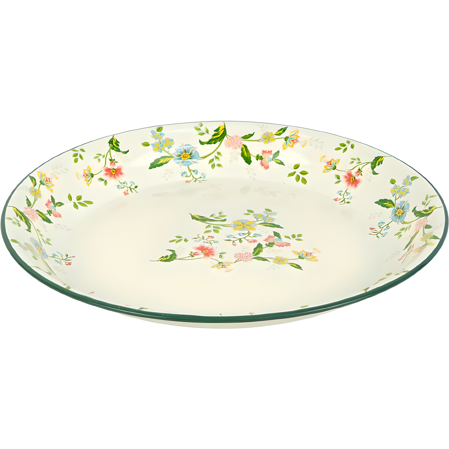 Круглий емальований піднос діаметром 36 см із яскравим квітковим принтом — практичний і декоративний одночасно. Емаль стійка до подряпин і легко миється після використання. Підходить для сервірування столу та перенесення посуду.