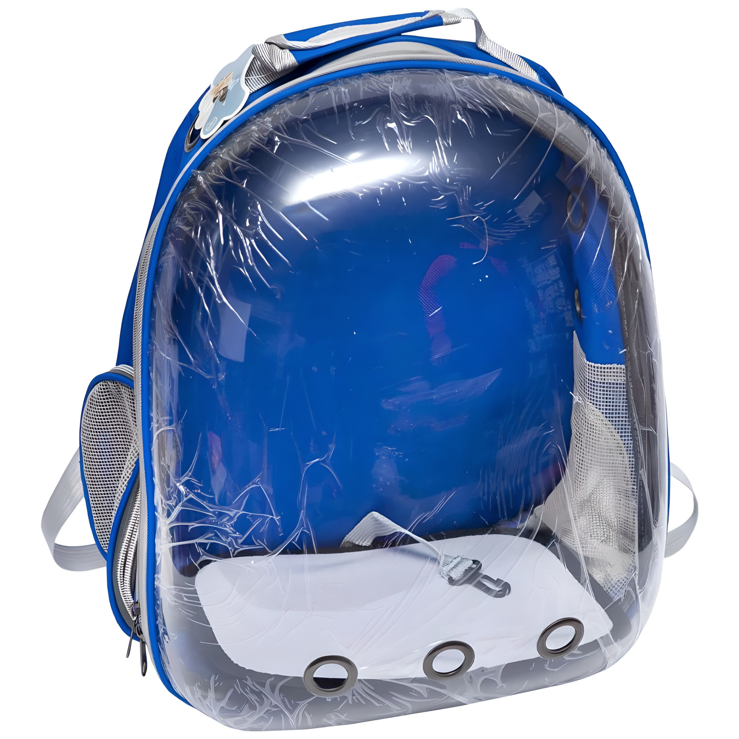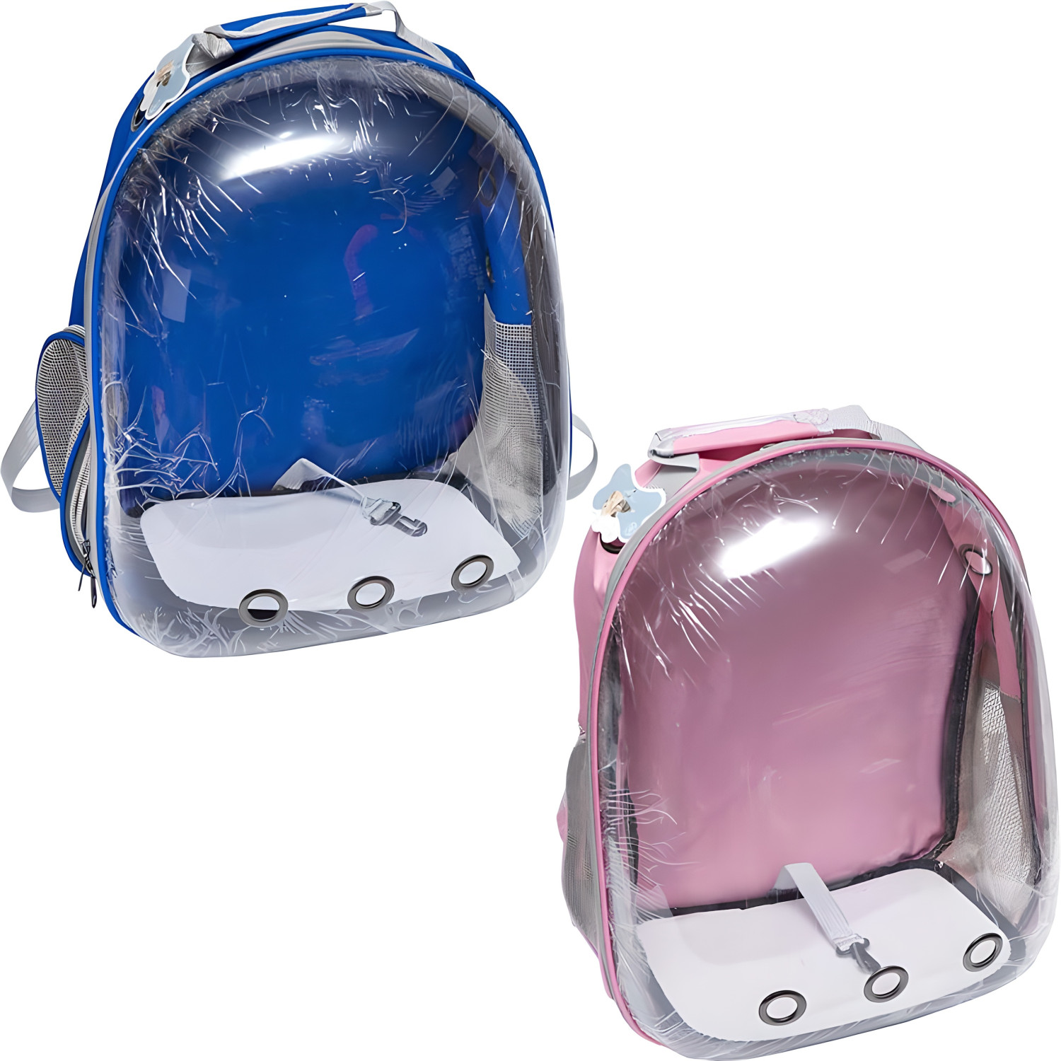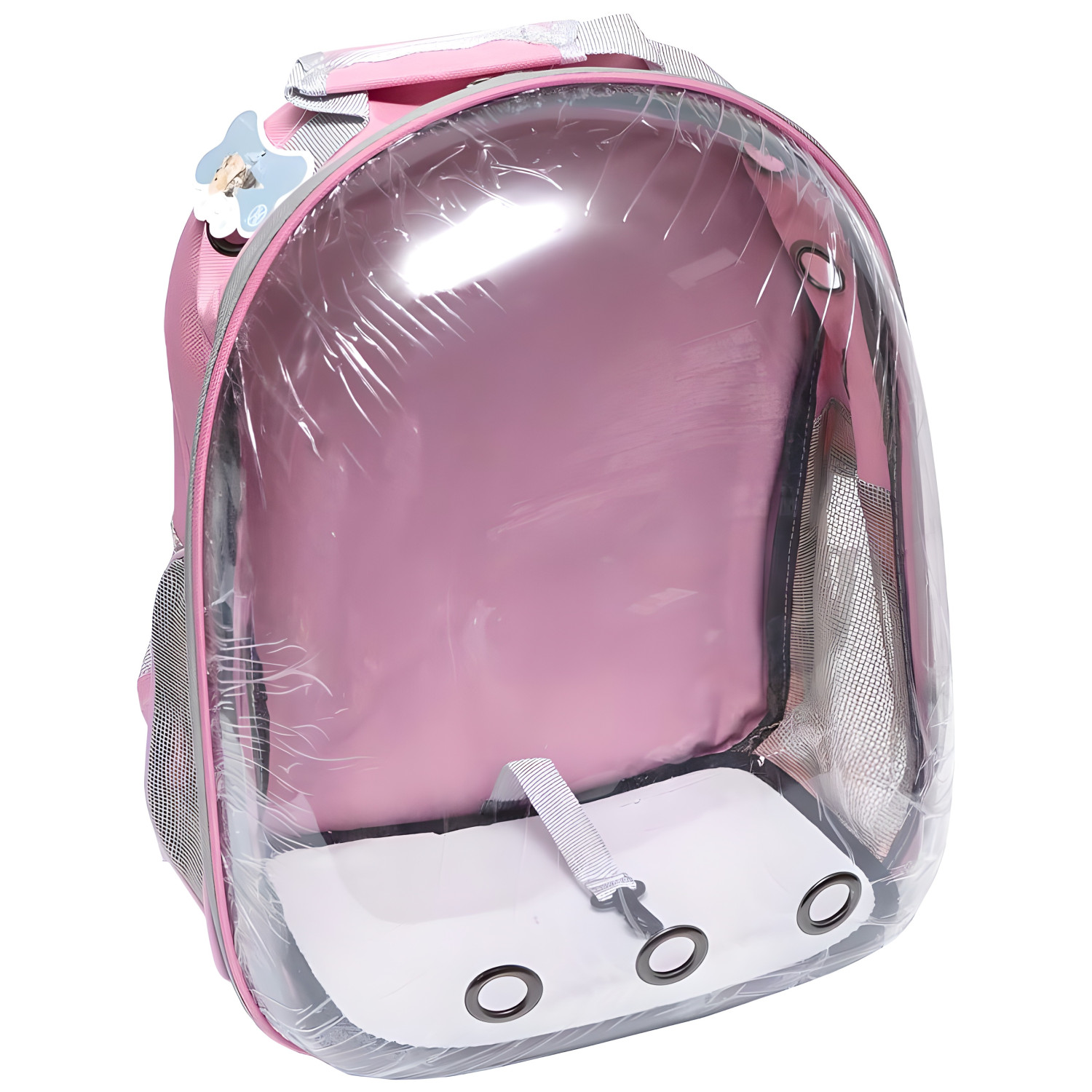 Прозорий рюкзак-переноска з вентиляційними отворами для кішок і собак дрібних порід. Є кишеня для пляшки з водою, щоб тварина завжди мала доступ до пиття. Розмір 42×35×22 см — зручно в дорозі та транспорті.