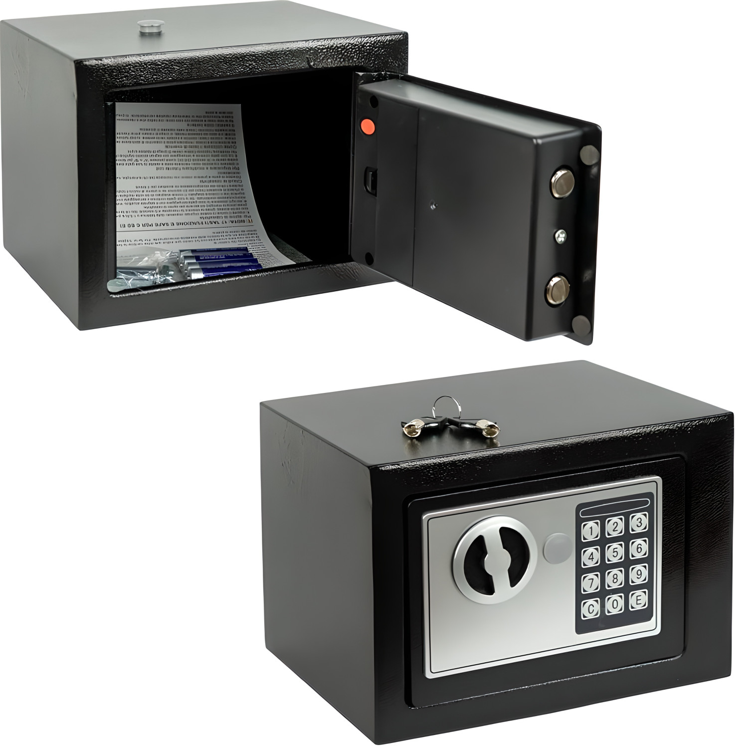 - Компактний металевий сейф T17 з електронним кодовим замком для надійного зберігання цінностей, документів та готівки вдома або в офісі. Корпус зі сталі стійкий до злому, цифровий замок програмується на особистий код. Зручний розмір для встановлення на полицю або в шафу.