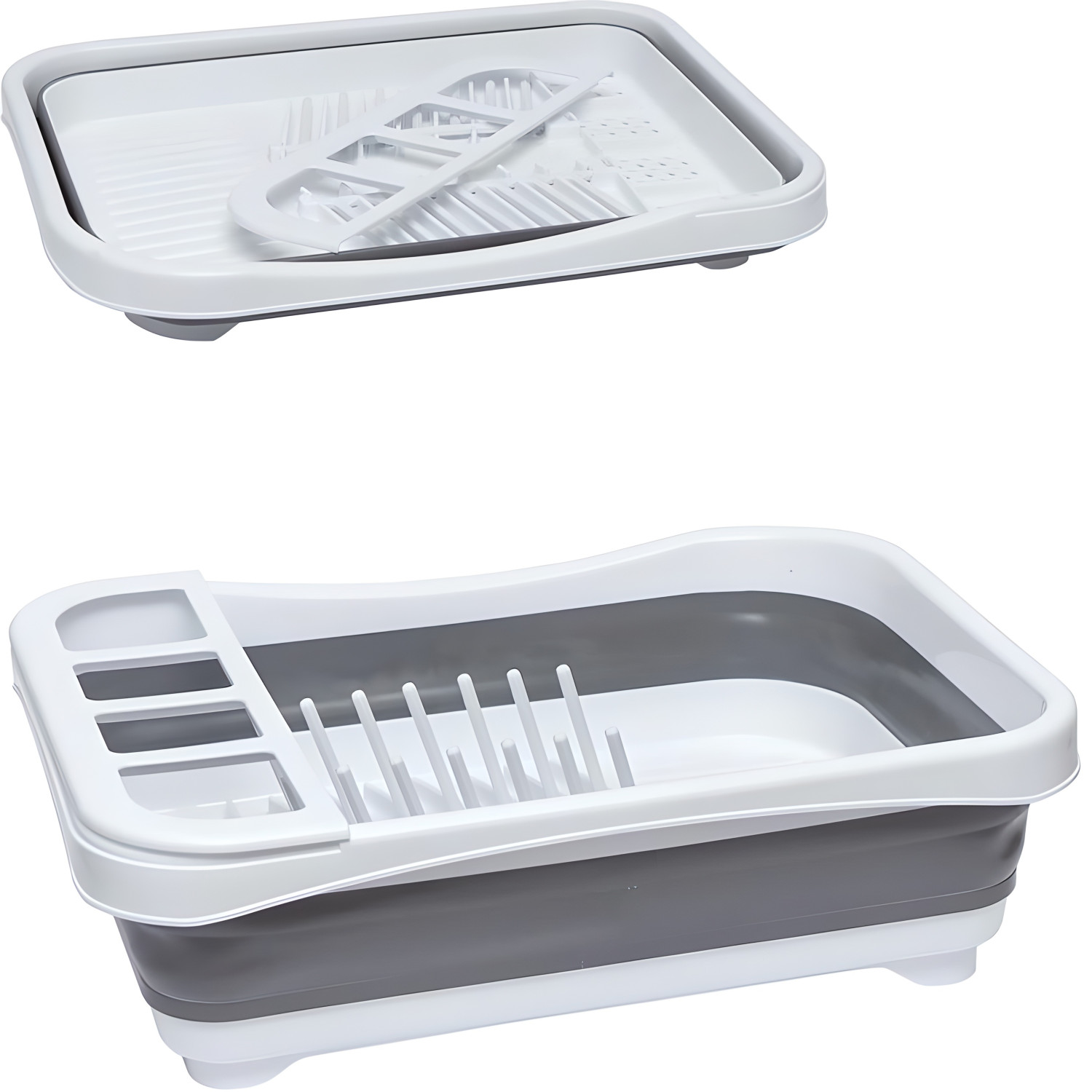 Компактна складана сушарка для посуду розміром 42×32×12 см із силіконовим дном і пластиковими відділеннями для тарілок і приборів. Після використання складається і займає вдвічі менше місця. Силіконовий килимок збирає воду і миється окремо.
