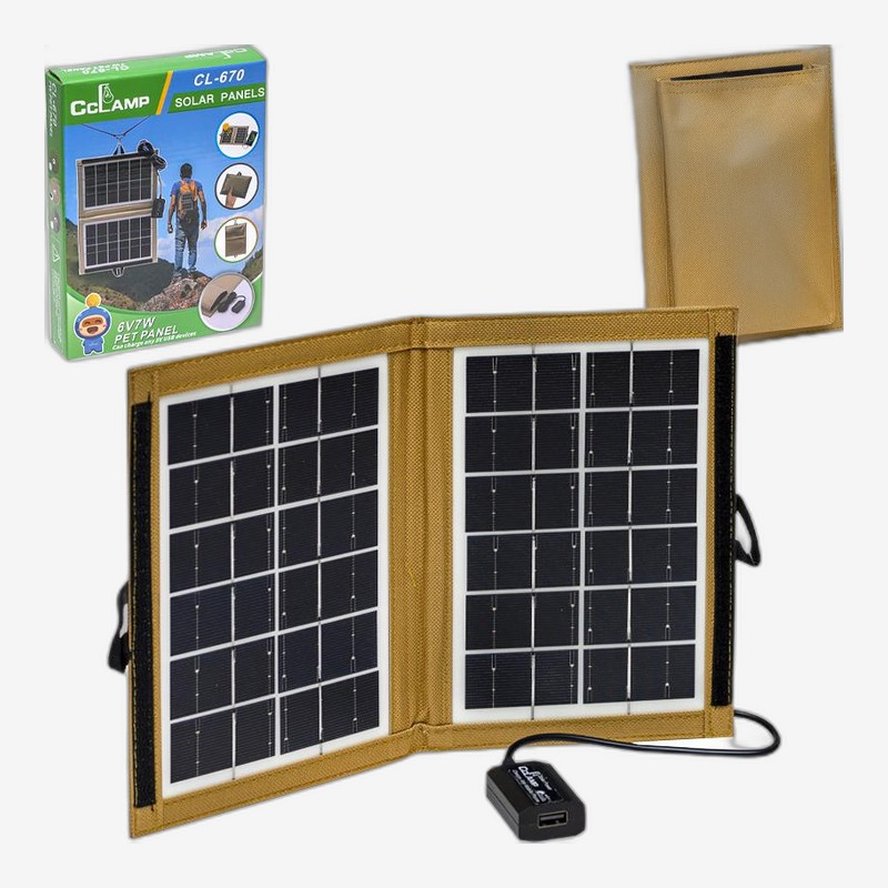- Портативна сонячна зарядна панель потужністю 7 Вт із USB-виходом заряджає смартфони та інші гаджети від сонячного світла — без розетки. Підходить для туристичних походів, кемпінгу або просто для заощадження електроенергії. Компактна й легка конструкція зручна у транспортуванні.