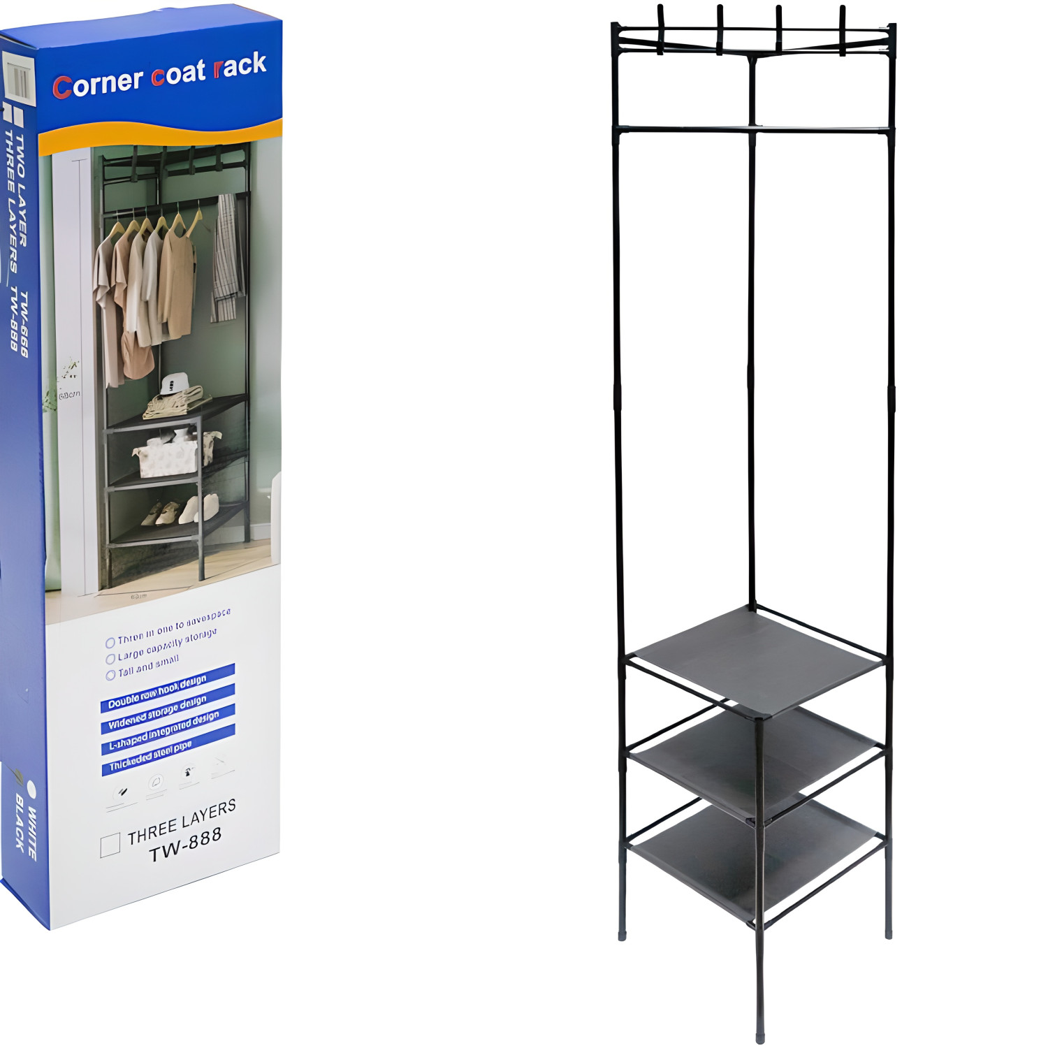 Кутова стійка-вішалка розміром 188×40×40 см з полицями для організації зберігання одягу та взуття в кутовому просторі. Ефективно використовує незадіяні кути кімнати та замінює громіздкий гардероб. Підходить для спальні, гардеробної або прихожої.