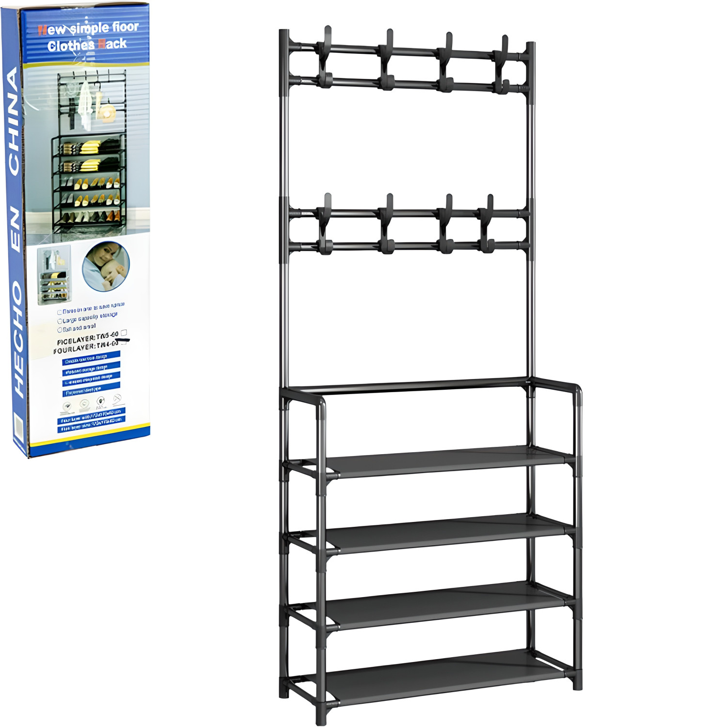 Вішалка-стелаж з чотирма полицями та штангою для одягу розміром 172×57×62 см для прихожої або спальні. Поєднує зберігання взуття, аксесуарів та одягу в одній конструкції. Проста в складанні та дозволяє тримати прихожу в порядку без громіздких меблів.