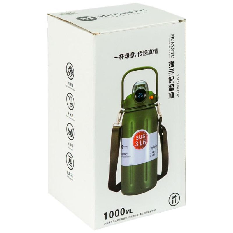 - Термос об'ємом 1 літр із нержавіючої сталі з плечовим ременем для зручного перенесення в дорозі. Зберігає температуру гарячих напоїв та їжі до 12 годин, холодних — до 24 годин. Підходить для туристичних походів, пікніків та офісного використання.