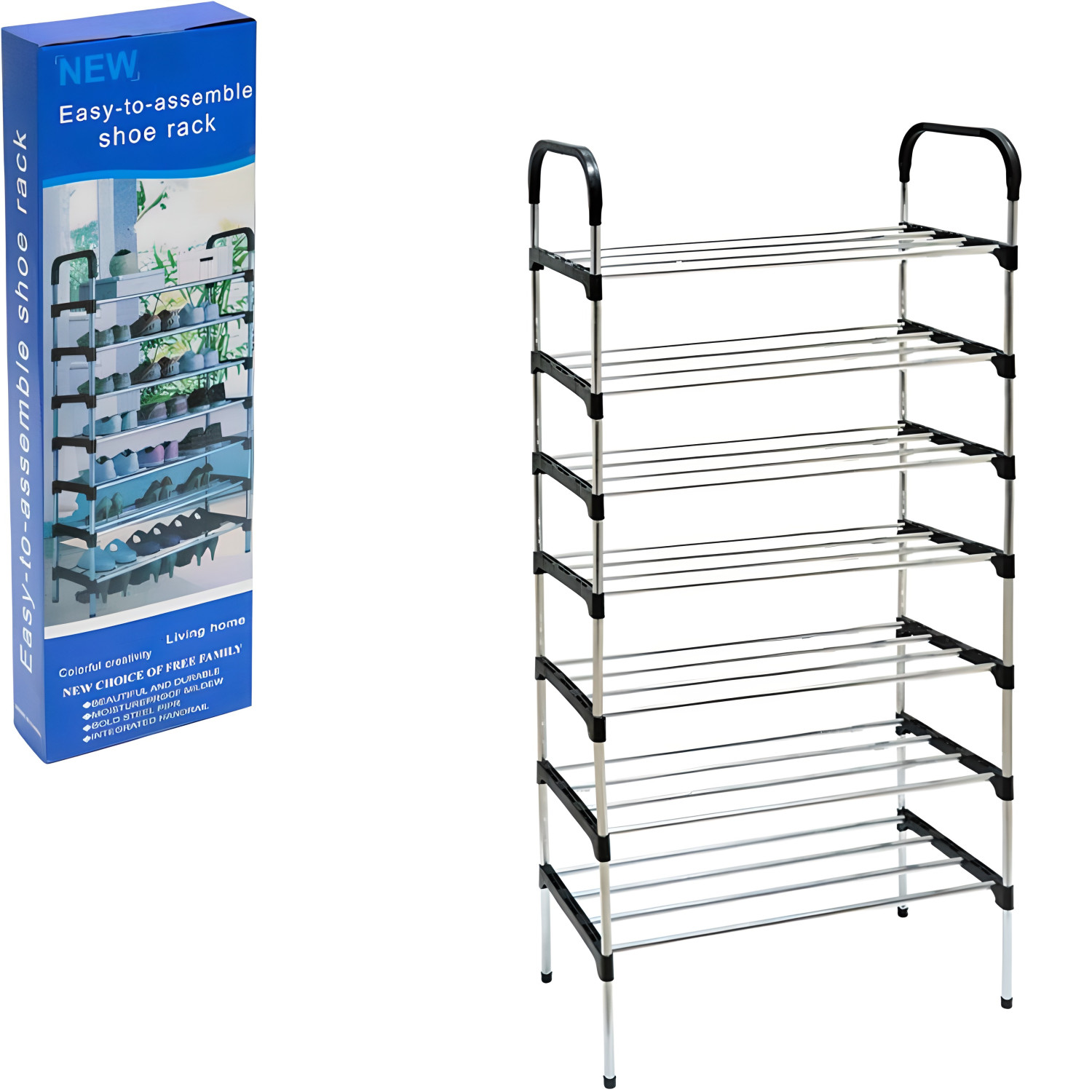 Семиярусна полиця для взуття заввишки 141 см для зберігання великої кількості взуття в коридорі або гардеробній. Раціонально використовує вертикальний простір і вміщує до 14 пар взуття. Легка збірна конструкція не потребує кріплення до стіни.