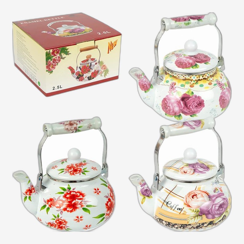• Чайник эмалированный 2,5л с керамической ручкой K254-2.5L — описание и характеристики Эмалированный чайник — практичная кухонная посуда для нагрева и кипячения воды. Объем — 2,5 л, диаметр дна — 18 см, диаметр горловины — 12 см, вес — 850 г. Корпус выполнен из металла с эмалированным покрытием, снар...