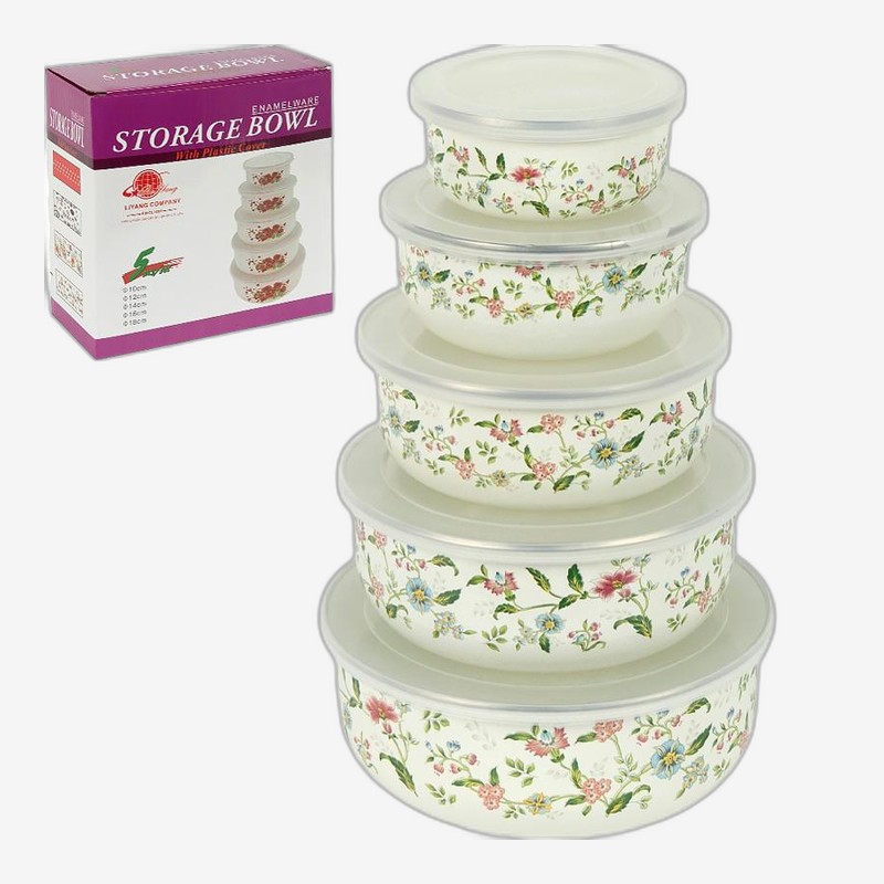 Набор эмалированных мисок-контейнеров 5шт 0,2/0,4/0,6/0,8/1л с крышками D10/12/14/16/18см 7043-17