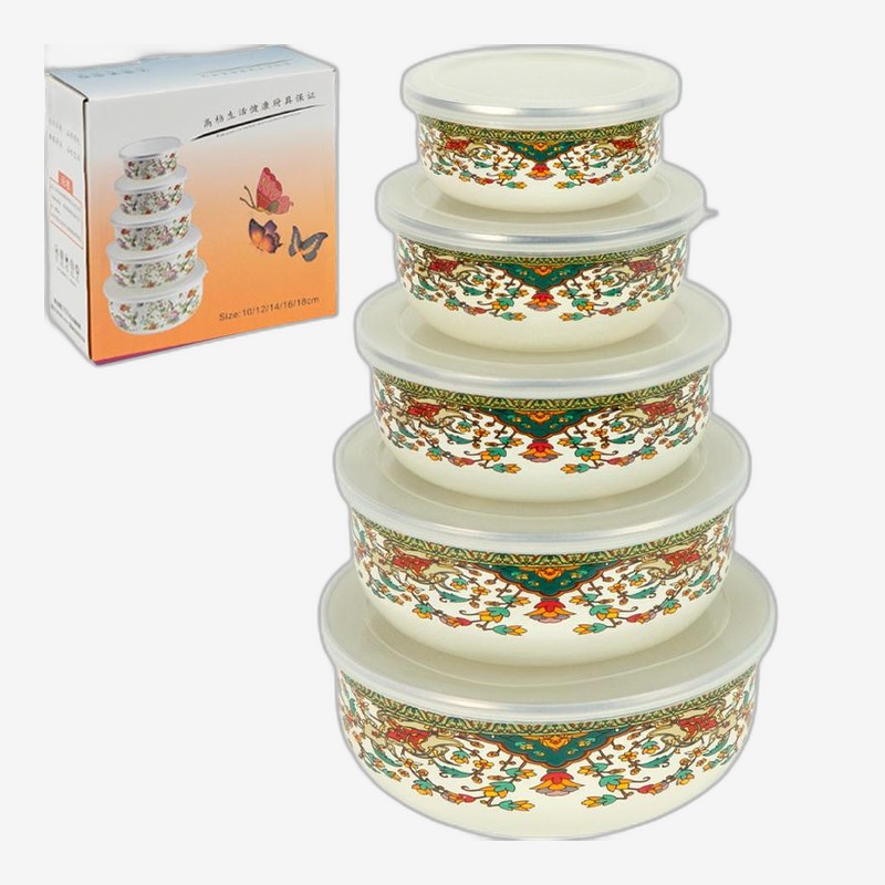 Набор эмалированных мисок-контейнеров 5шт 0,2/0,4/0,6/0,8/1л с крышками D10/12/14/16/18см 7043-19