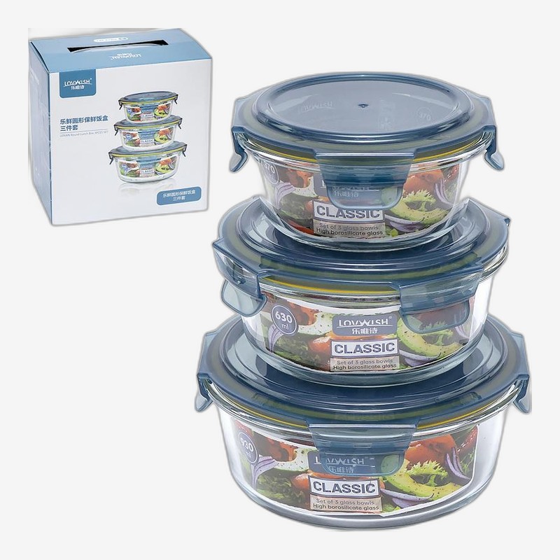 Набір харчових контейнерів 3 шт круглі скло 370/630/930 мл LXYW/L3