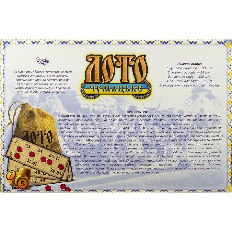 • Игра - лото "Чумацьке" деревянные бочонки — купить в Китайке Настольная игра «Чумацьке Лото» — это увлекательное и динамичное развлечение для всей семьи или компании друзей. Изготовлена из экологически чистых материалов: деревянные бочонки не вызывают аллергических реакций. В комплект входят 90 дере...