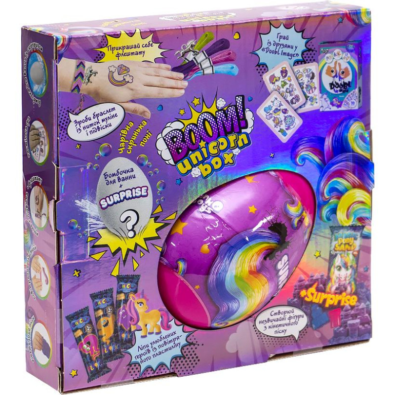 - Креативное творчество "Boom! Unicorn Box" укр/рус — купить в Китайке Целостность товара необходимо проверять на почте. В комплектации: Песок кинетический "Magic Poni Sand" 150гр. 1шт, воздушный пластилин в брикете 3шт, нитки мулине 4шт, подвеска 1шт, настольная игра "Doobl image" 1шт, лист с флештат...