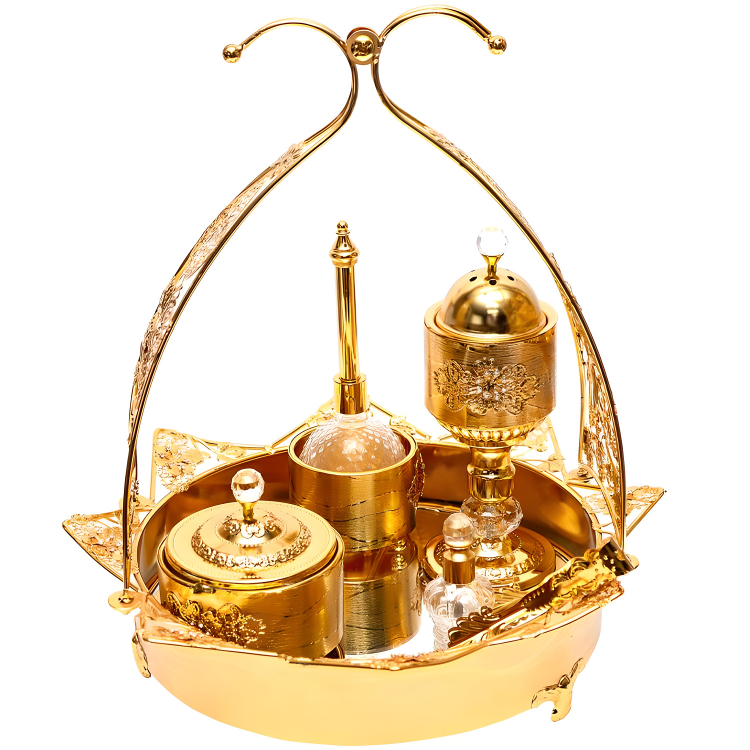 \nНабор для чаепития включает сахарницу, щипцы, сосуд для аромасвечи и два сосуда для аромасессий. Подставка имеет зеркальное дно. Цвет золотой, материалы — стекло и металл.