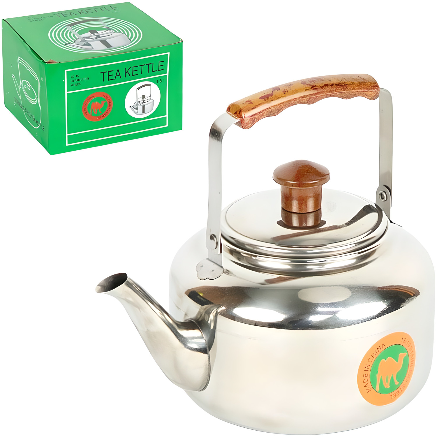 - Класичний чайник об'ємом 1,5 літра з нержавіючої харчової сталі для приготування окропу на газовій або електричній плиті. Корпус не окислюється та не надає воді стороннього присмаку, ергономічна ручка з теплоізоляцією захищає від опіків. Підходить для всіх типів плит, крім індукції.