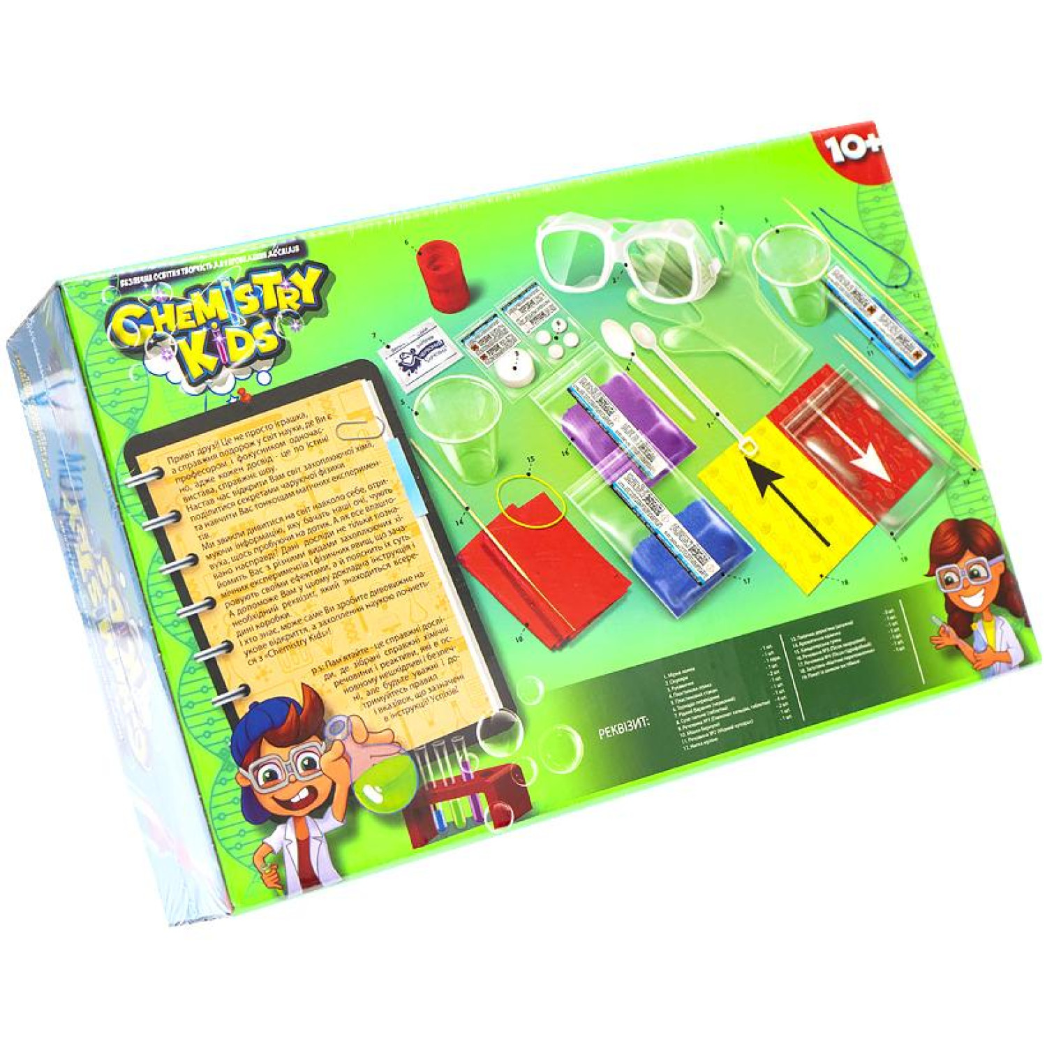 \n"CHEMISTRY KIDS" - это образовательный набор для проведения опытов. Подходит для детей старше 10 лет. В комплекте представлены инструменты и материалы для различных научных экспериментов. Размер упаковки составляет 34 х 23 х 8,5 см.