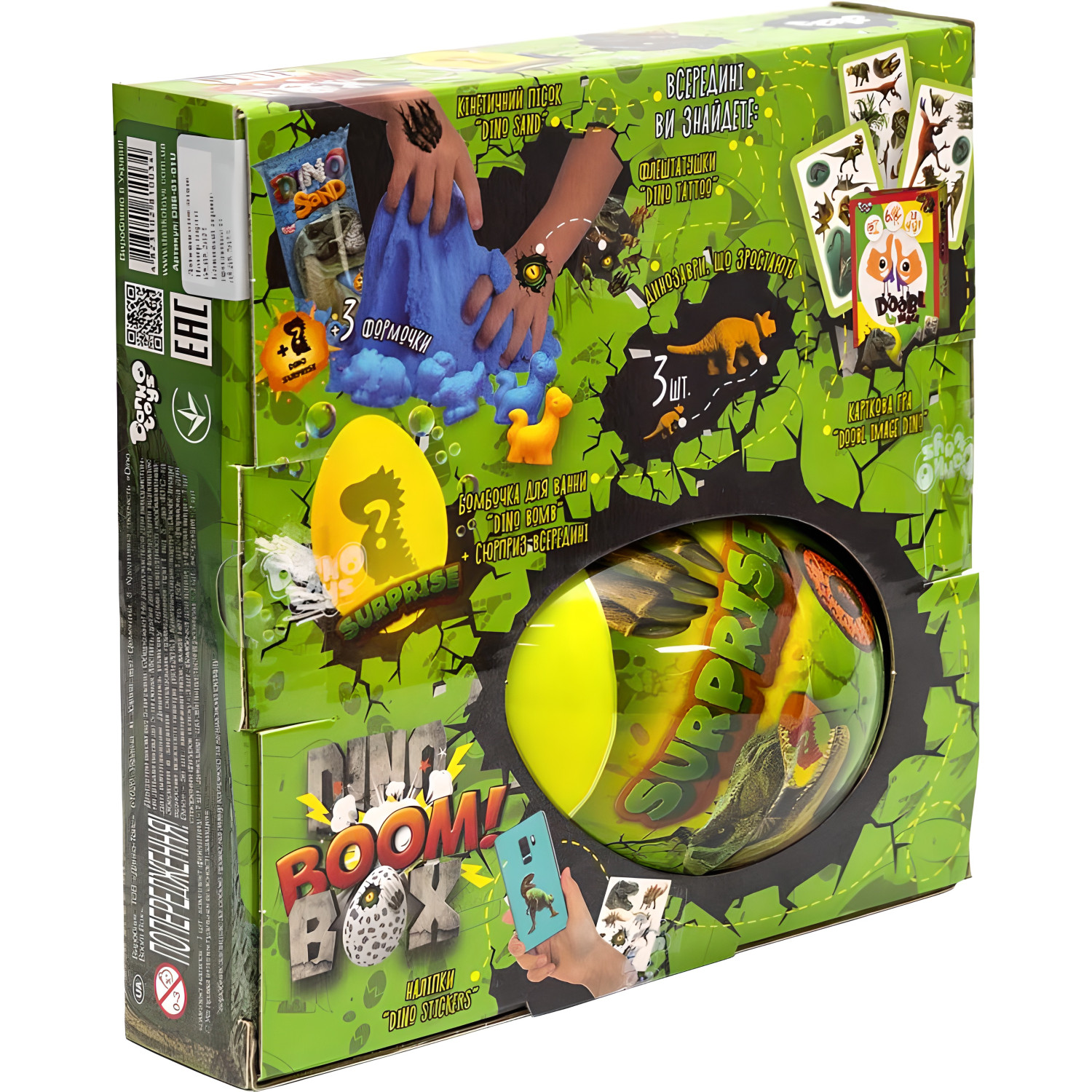 \nНабор включает 150 г кинетического песка "Dino send", три формочки для создания фигур, флештатушки "Dino tattoo", три растущих динозавра, карточную игру "Doobl image dino", бомбочку для ванны в форме яйца "Dino bomb" с сюрпризом, наклейки "Dino stickers" и инструкцию. Размер набора 18,5х18,5х9 см. Рекомендуется для детей от 5 лет.
