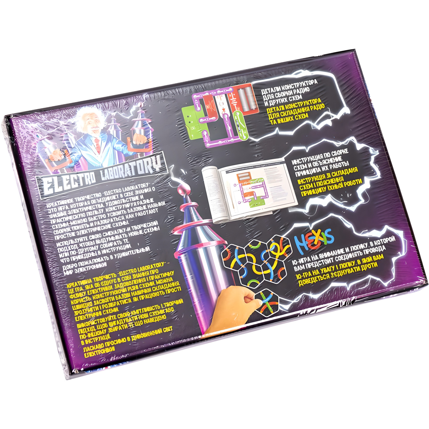 \nЭлектронный конструктор "Electro Laboratory. FM Radio" предназначен для изучения основ физики электричества и сборки электрических схем. С его помощью можно собрать радио и другие схемы. В комплект входит инструкция и IQ-игра HEXIS. Размер конструктора составляет 37х25х4см. Подходит для детей старше 6 лет.