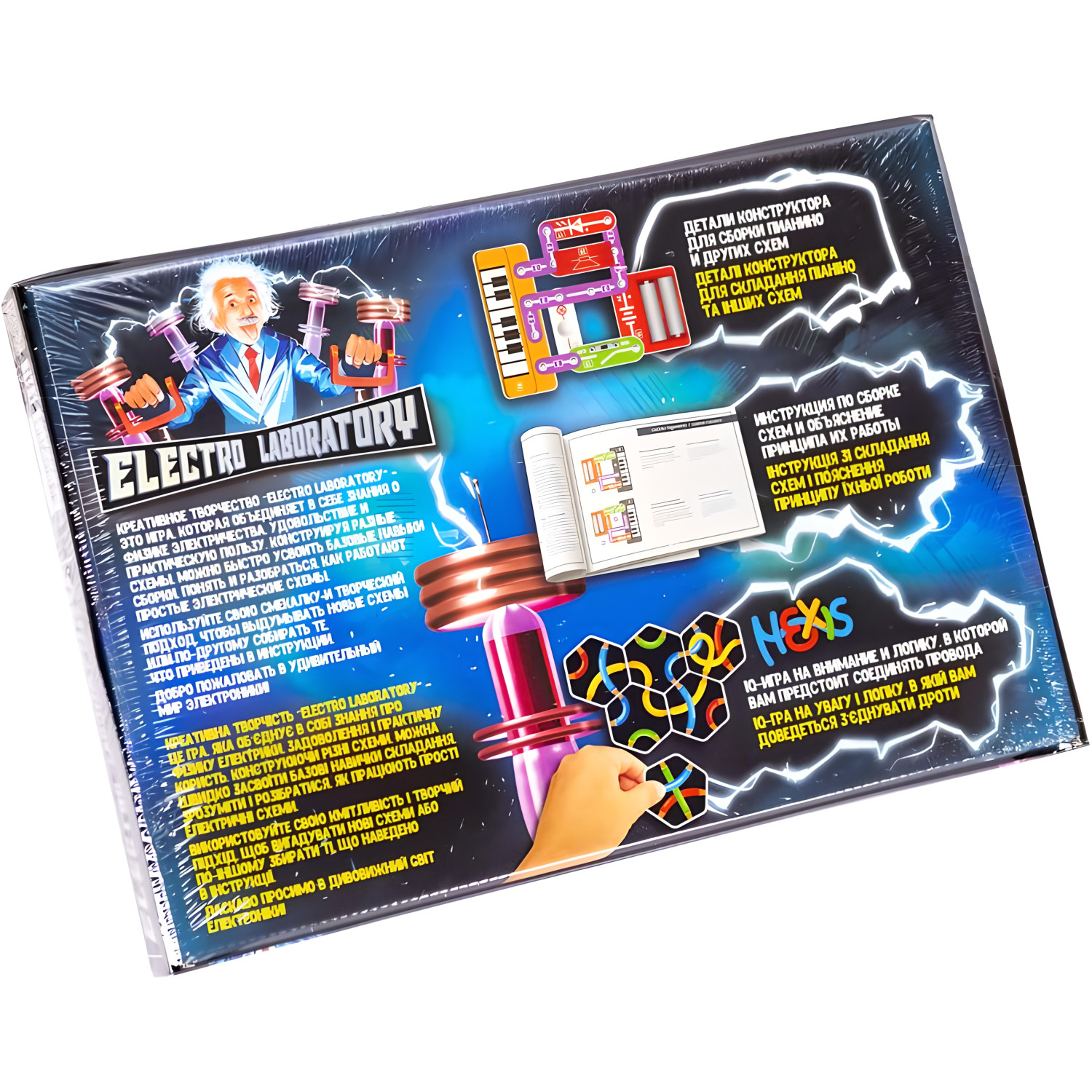 \nЭлектронный конструктор "Electro Laboratory. Piano" позволяет усвоить базовые навыки сборки и понять принципы работы простых электрических схем. Из деталей конструктора можно собрать пианино и другие схемы. В комплект входит инструкция и IQ-игра HEXIS. Размер конструктора составляет 37х25х4 см. Подходит для детей старше 6 лет.