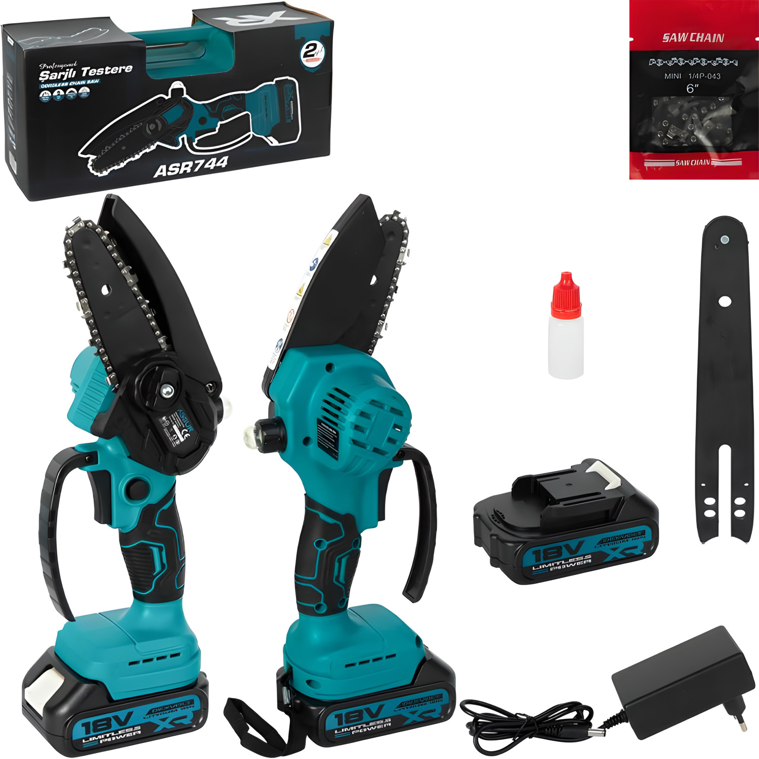Пила работает от аккумулятора(2шт) с номинальным напряжением 18V, что обеспечивает мобильность и удобство без привязки к электросети. В комплекте предусмотрены направляющие шины размером 4 и 6 дюймов (15 и 20 см), а также цепи на 14 и 18 зубьев, что позволяет выбрать оптимальный вариант под конкретные задачи. Компактные размеры и малый вес снижают нагрузку на руки и обеспечивают комфортную работу даже при длительном использовании. Эргономичная рукоятка способствует надёжному удержанию инструмента. Аккумуляторная цепная пила станет удобным решением для точных работ и регулярного ухода за участком.