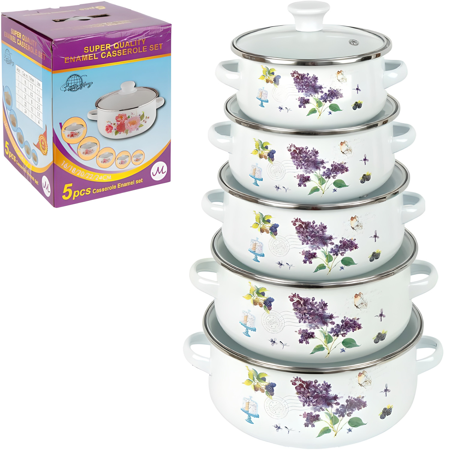 Набор эмалированных кастрюль предназначен для приготовления и подогрева различных блюд. В комплект входит 5 кастрюль с ручками объемом 4000 мл, 3100 мл, 2300 мл, 1600 мл и 1100 мл. Диаметр кастрюль составляет 24 см, 22 см, 20 см, 18 см и 16 см соответственно. Изготовлены из металла с эмалированным покрытием, снаружи нанесен декоративный рисунок. Кастрюли имеют аккуратный ободок по верхнему краю. В комплект входят стеклянные крышки со съемными ручками, что удобно при использовании и хранении. Набор упакован в коробку размером 30×24×24 см с ручкой для удобной переноски. Подходит для приготовления различных блюд и ежедневного использования на кухне. Цена указана за набор.