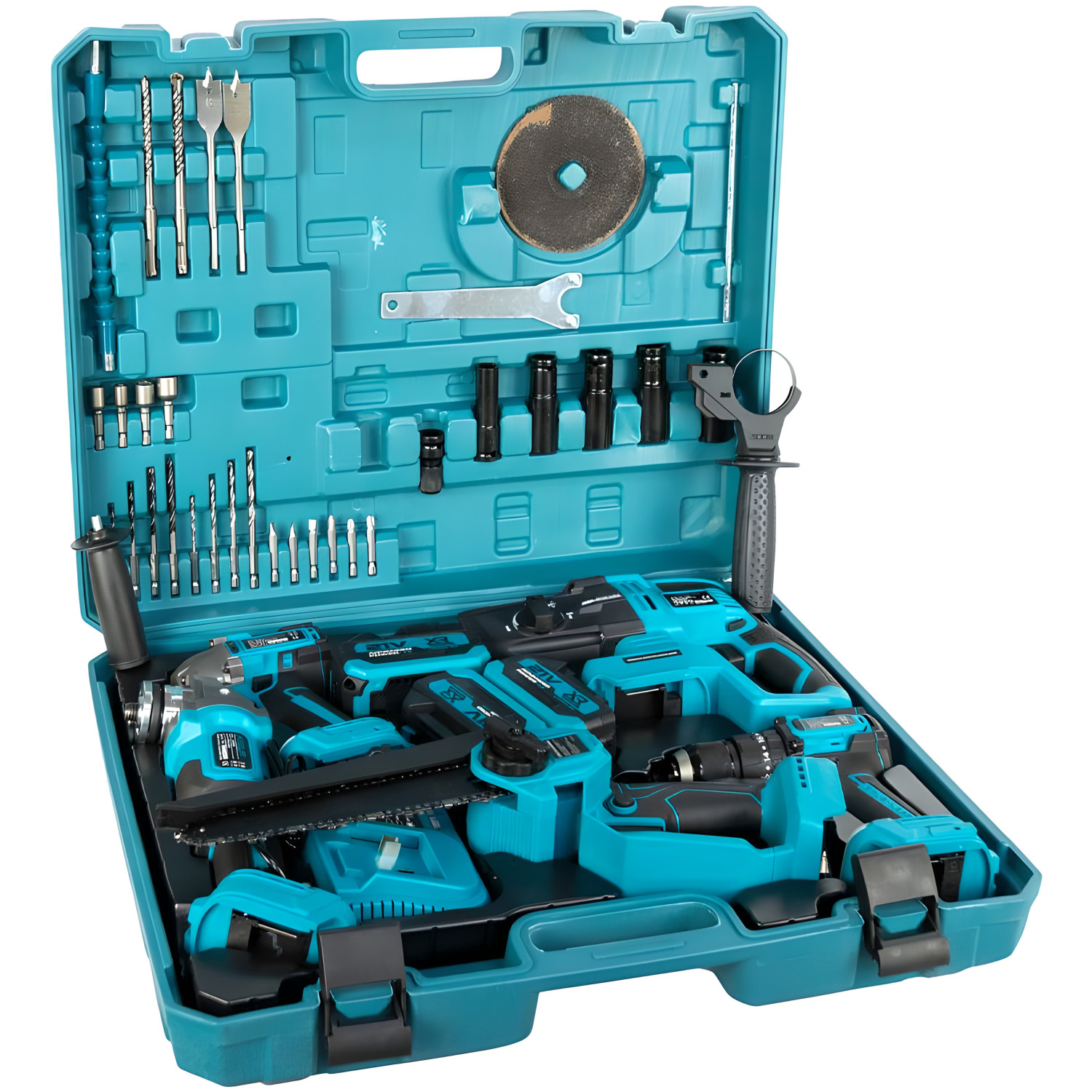 Универсальный аккумуляторный набор инструментов предназначен для широкого спектра строительных, ремонтных и садовых работ. В комплект входит бесщеточная дрель с металлическим патроном 10 мм, аккумуляторный гайковёрт с крутящим моментом до 350 Н·м, угловая шлифмашина диаметром 125 мм, а также аккумуляторная цепная пила с шиной 8 дюймов.