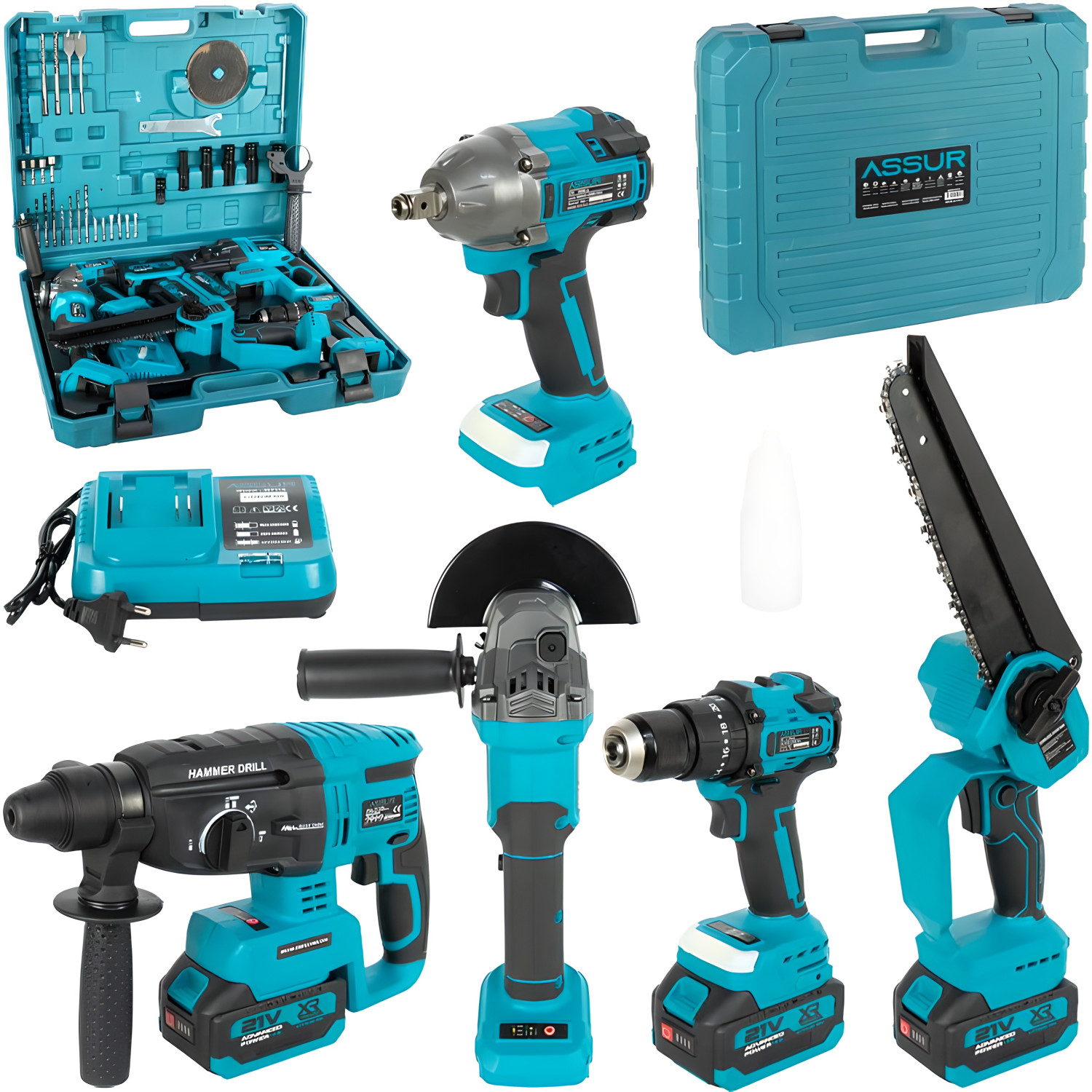 Аккумуляторный набор инструментов 5-в-1, 21V, бесщеточный, с цепной пилой и кейсом (ASR1201) — описание и характеристики