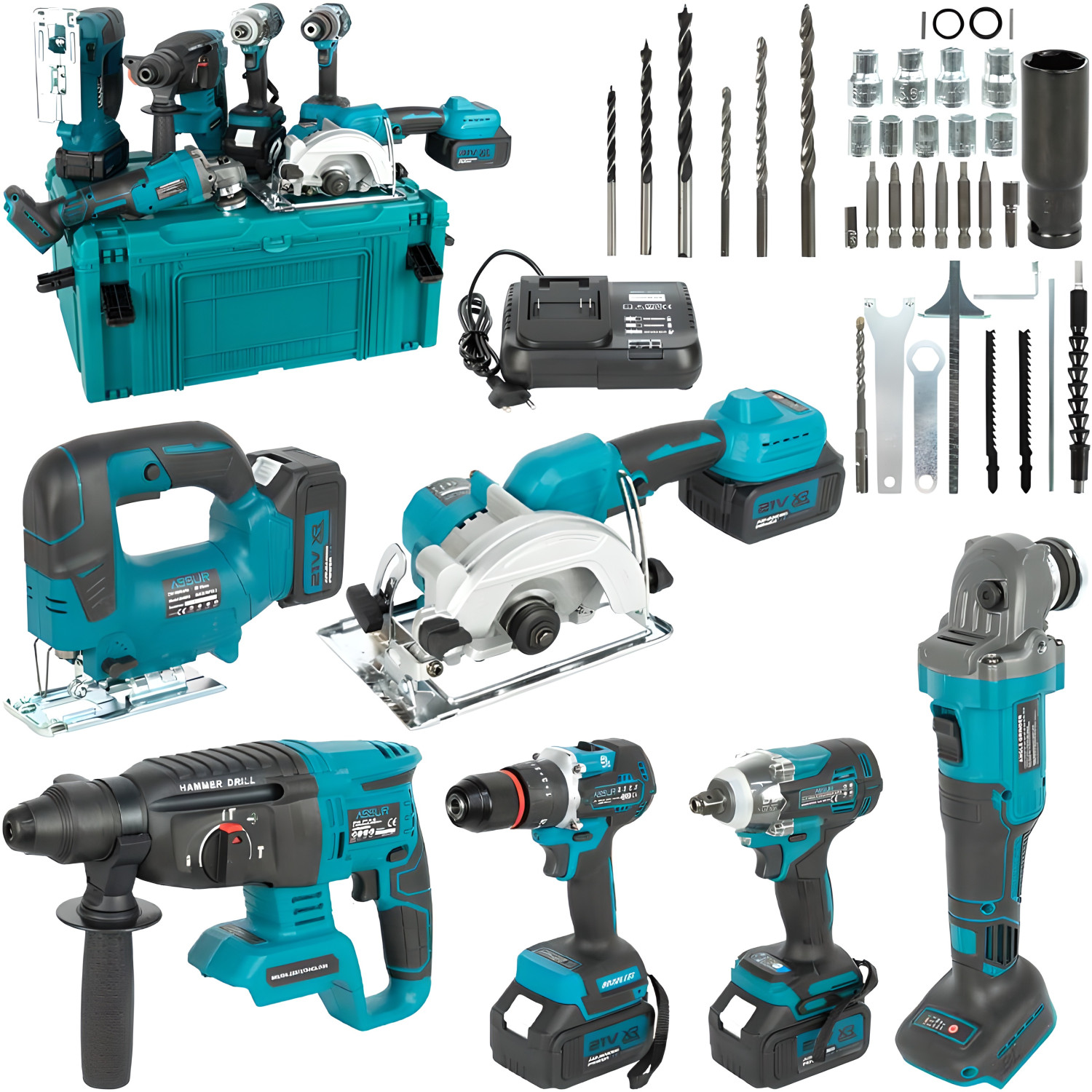 Многофункциональный аккумуляторный набор инструмента 6-в-1 предназначен для строительных, монтажных и ремонтных работ. В комплект входят: бесщеточная угловая шлифмашина 125 мм, бесщеточный электрический гайковёрт, бесщеточный перфоратор 26 мм, бесщеточная ударная дрель 13 мм, бесщеточная циркулярная пила и лобзик (щеточный).