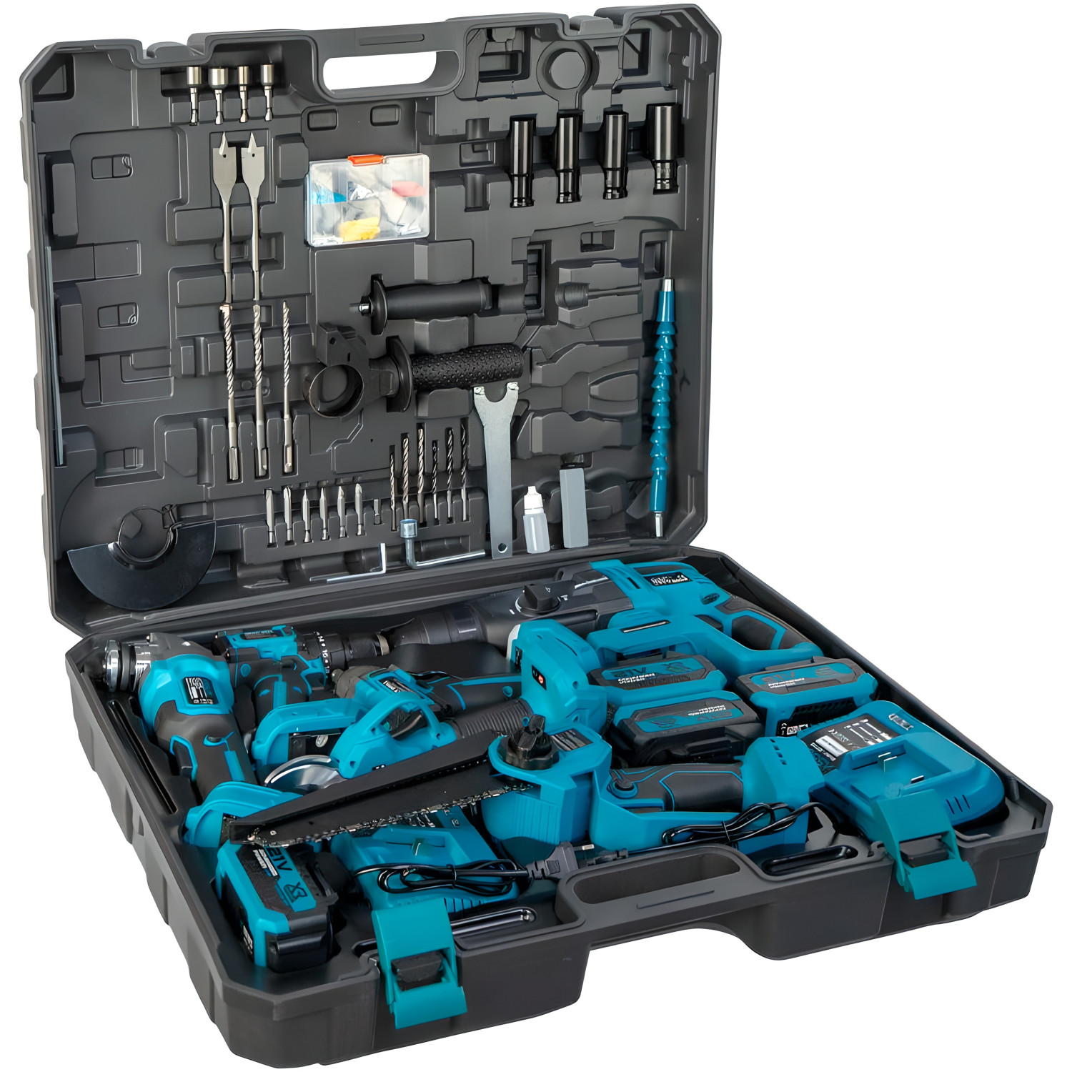 Профессиональный аккумуляторный набор инструментов предназначен для интенсивных строительных, монтажных и садовых работ. В комплект входит бесщеточная дрель с металлическим патроном 10 мм, аккумуляторный гайковёрт с крутящим моментом до 350 Н·м и угловая шлифмашина с диском 125 мм.