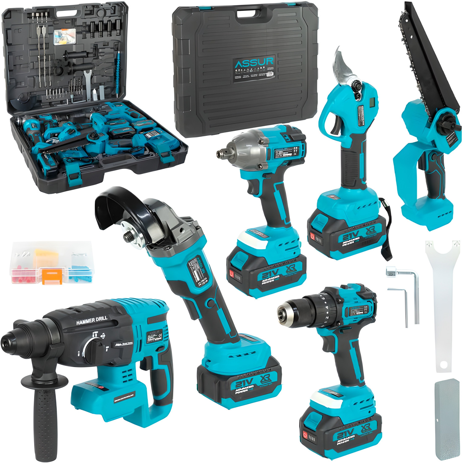 Также в наборе представлена бесщеточная аккумуляторная цепная пила 8 дюймов с цифровым дисплеем и встроенной системой подачи масла, обеспечивающей стабильную и безопасную работу. Аккумуляторные ножницы оснащены цифровым индикатором для контроля состояния инструмента. Питание обеспечивают четыре аккумулятора ёмкостью 1500 mAh класса 5C с двойным рядом из 10 элементов и мягким защитным корпусом. В комплект входит два стационарных зарядных устройств . Дополнительно предусмотрен перфоратор с набором аксессуаров. Все элементы аккуратно размещены в прочном пластиковом кейсе .