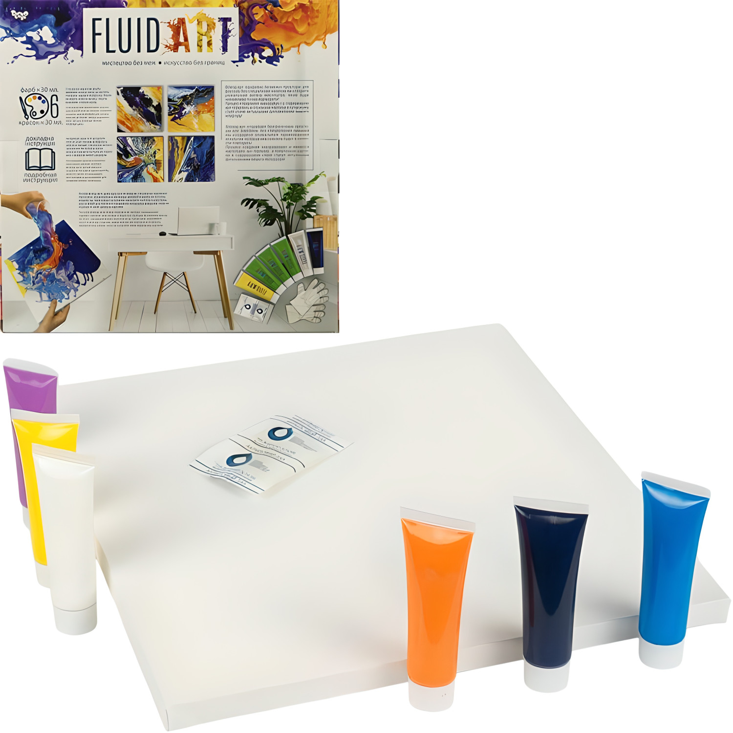 \nНабор для творчества Fluid Art (31×31 см, 6 красок по 30 мл)\nСоздайте стильную интерьерную картину своими руками с набором Fluid Art!\nТехника флюид-арт проста и не требует специальных навыков: достаточно вылить краску на холст и слегка наклонить его в разные стороны, чтобы получить уникальные и неповторимые узоры.\nВ набор входит:\nХолст на деревянном подрамнике 31×31 см\n6 акриловых красок по 30 мл\nПара перчаток\nИнструкция\nОсобенности:\n✔ Легко и интересно — идеально для новичков и взрослых\n✔ Быстрый результат — картина готова за 30–40 минут\n✔ Уникальный дизайн для вашего интерьера\n✔ Отличный подарок для детей и взрослых