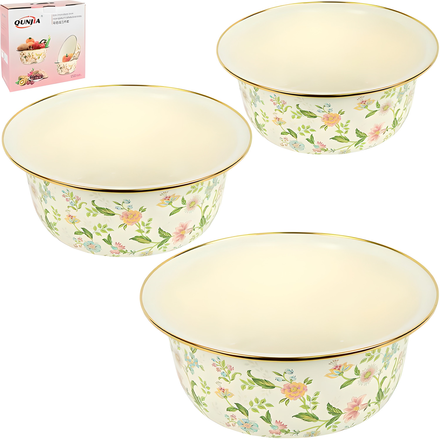 Набор эмалированной кухонной посуды подходит для приготовления и хранения продуктов, замешивания теста, салатов и других домашних задач. В комплект входят 3 емкости диаметром 24 см, 28 см и 32 см, высота соответственно 10,5 см, 11 см и 11,5 см, объем 3 л, 4,5 л и 6 л. Благодаря глубокой форме и расширенному верхнему краю их удобно использовать для смешивания ингредиентов. Основа выполнена из металла с эмалированным покрытием, внутренняя поверхность гладкая и легко очищается. Снаружи нанесен декоративный орнамент, а по верхнему краю проходит металлический золотистый ободок. Набор упакован в коробку с ручкой размером 33×33×13 см. Цена указана за набор.