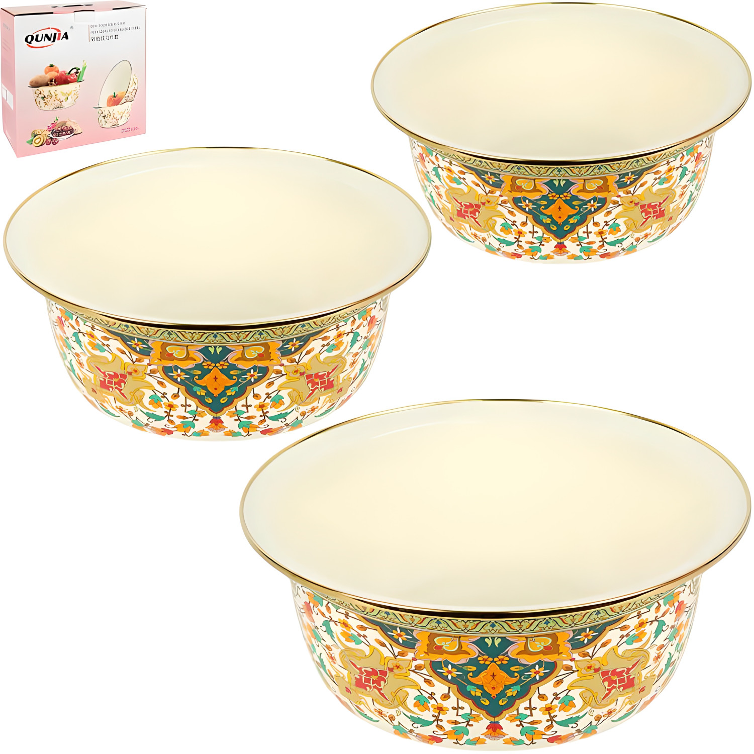 Набор эмалированной кухонной посуды подходит для приготовления и хранения продуктов, замешивания теста, салатов и других домашних задач. В комплект входят 3 емкости диаметром 24 см, 28 см и 32 см, высота соответственно 10,5 см, 11 см и 11,5 см, объем 3 л, 4,5 л и 6 л. Благодаря глубокой форме и расширенному верхнему краю их удобно использовать для смешивания ингредиентов. Основа выполнена из металла с эмалированным покрытием, внутренняя поверхность гладкая и легко очищается. Снаружи нанесен декоративный орнамент, а по верхнему краю проходит металлический золотистый ободок. Набор упакован в коробку с ручкой размером 33×33×13 см. Цена указана за набор.