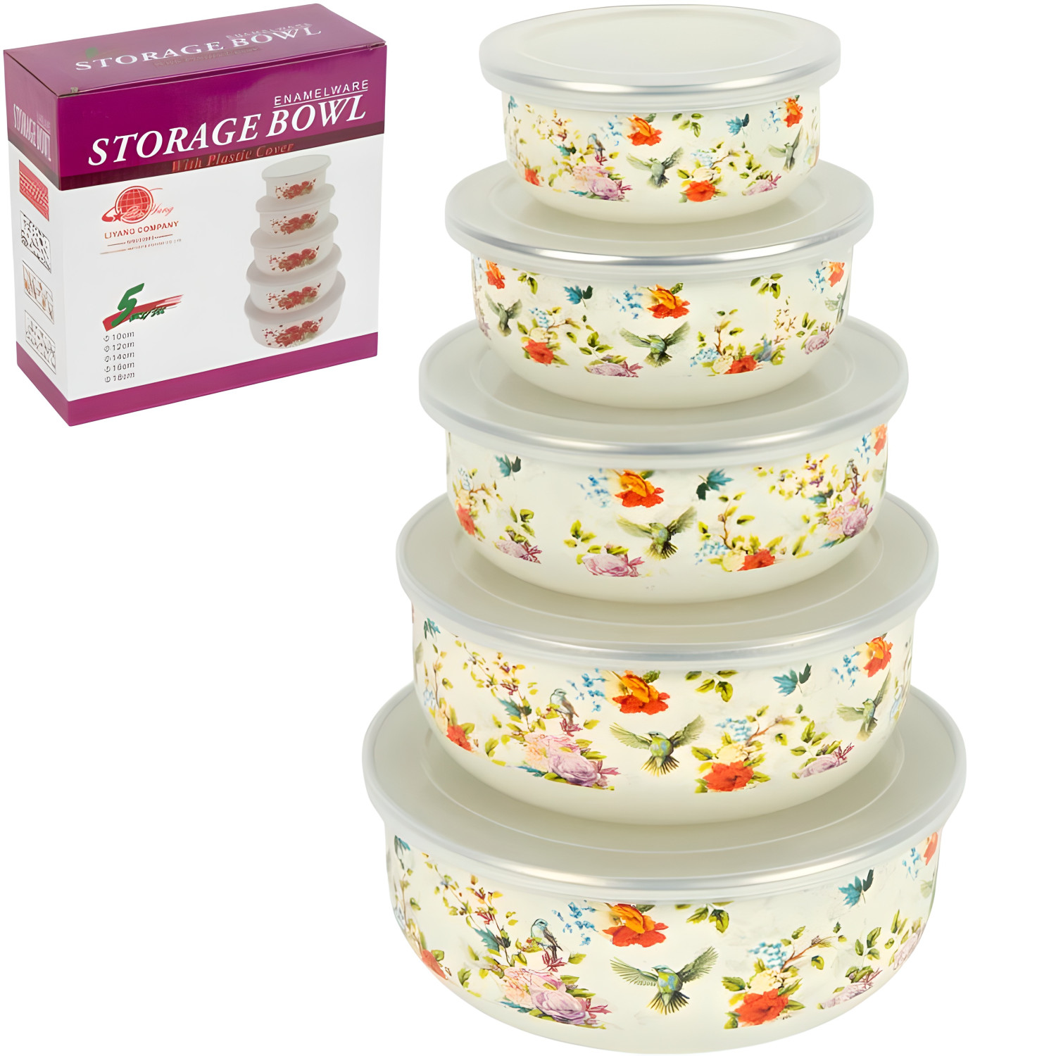 Набор эмалированных мисок-контейнеров 5шт 0,2/0,4/0,6/0,8/1л с крышками D10/12/14/16/18см 7043-18 — описание и характеристики