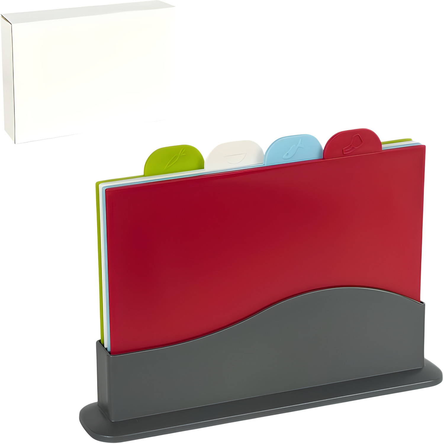 \nНабор разделочных досок с подставкой, 4 шт (арт. 9098) — компактный и удобный комплект для кухни, который помогает поддерживать гигиену и порядок при приготовлении пищи. Каждая доска имеет индивидуальный цвет и пиктограмму для разных типов продуктов, что предотвращает смешивание запахов и перекрёстное загрязнение:\n Красная — для мяса\n Синяя — для рыбы\n Зелёная — для овощей и фруктов\n Белая — для готовых блюд\n✅ Размер каждой доски: 27×19 см\n✅ Подставка для хранения обеспечивает аккуратность и вентиляцию\n✅ Изготовлены из безопасного и прочного пищевого пластика\n✅ Лёгкие, удобные в использовании, можно мыть в посудомоечной машине\n Комплектация: 4 доски + подставка