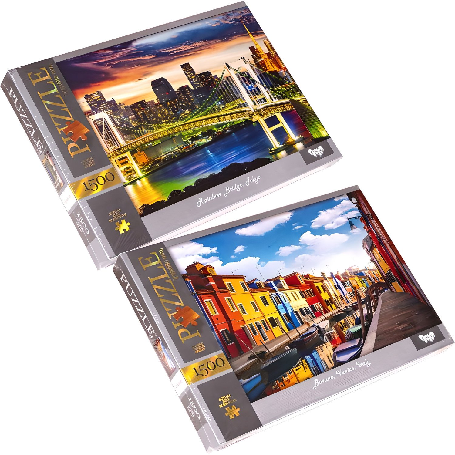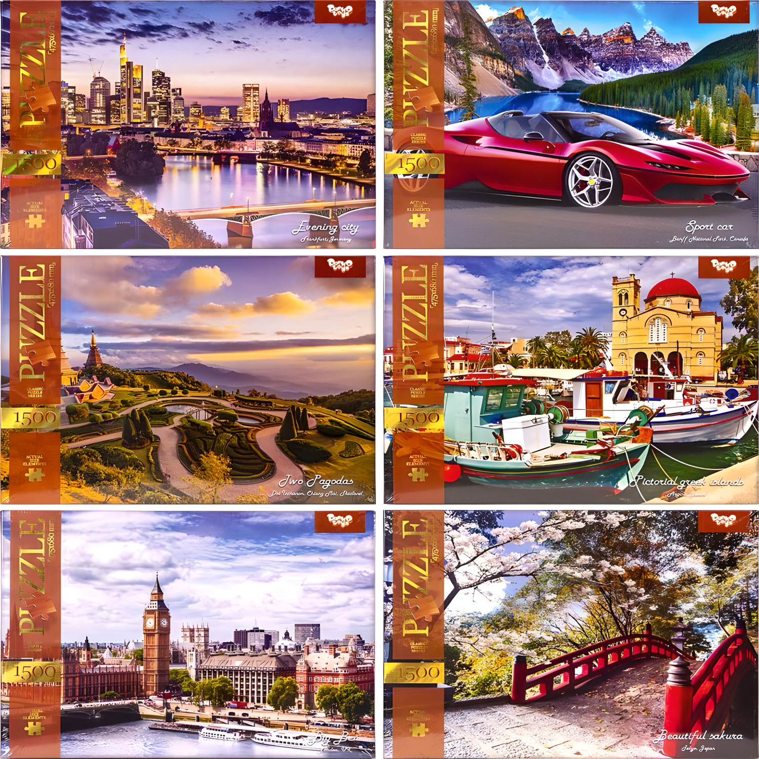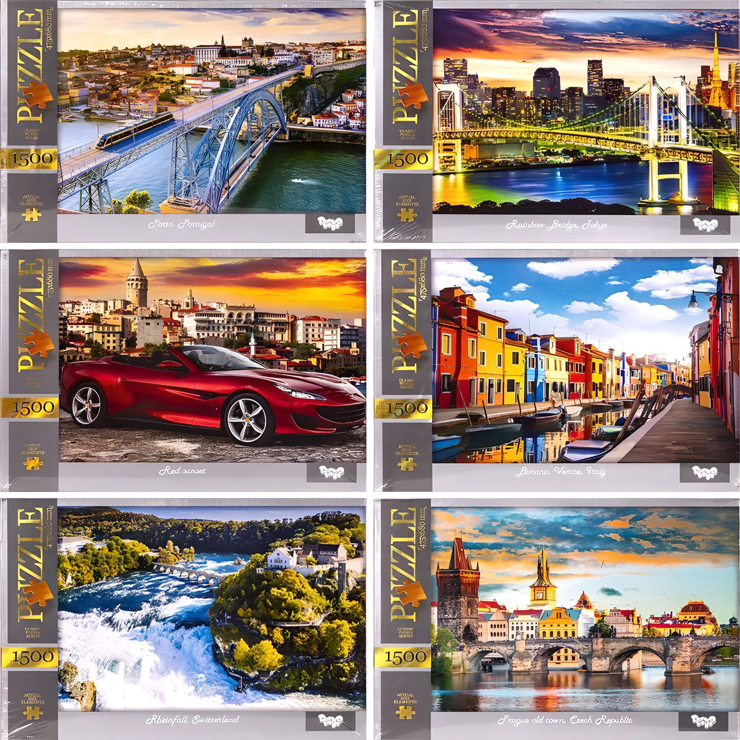 Пазл состоит из 1500 элементов, собранный размер которого составляет 680 х 475 мм. Изображения на пазлах представлены в разнообразном ассортименте.