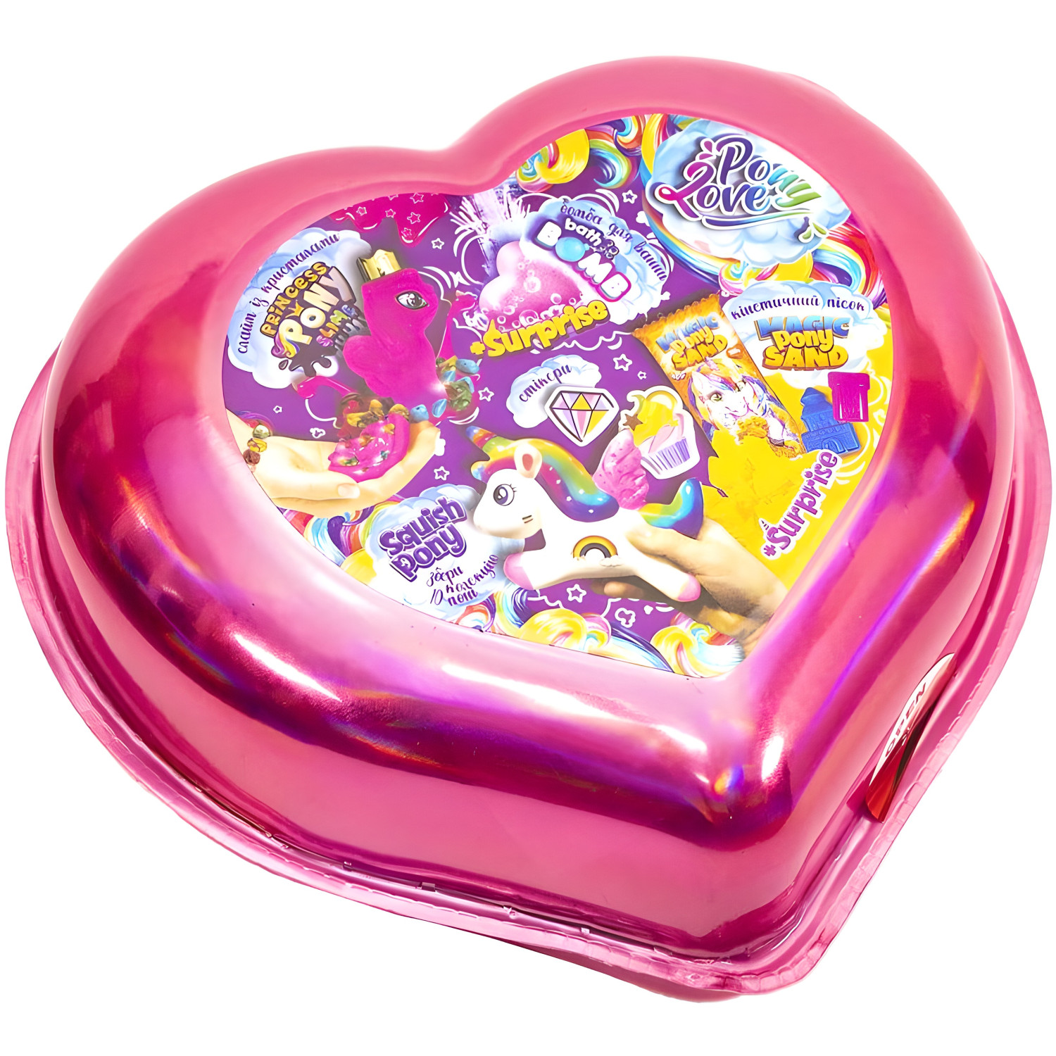 \nНабор для творчества "Pony Love" включает 5 элементов: Squish Poni, слайм с кристаллами Princess Poni Slime, бомба для ванны в форме сердца, кинетический песок Magic Pony Sand и формочки. Также в комплект входят кристаллы и резинка для создания браслета, набор стикеров и инструкция. Подходит для детей от 5 лет. Размер набора 20х18х10 см. Оформление на украинском языке.